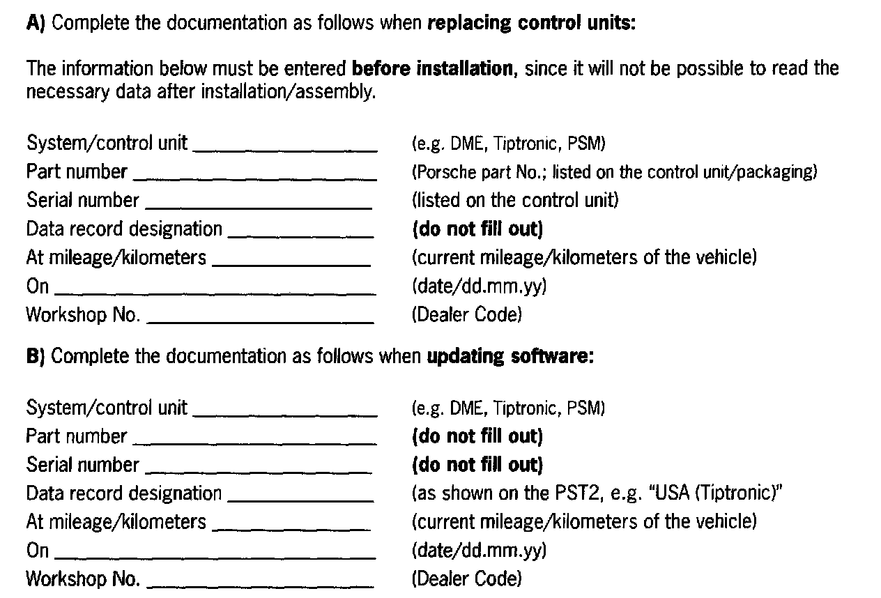 This documentation is a record of replacement and/or updated versions in the vehicle. Whenever a control unit is replaced or new software is installed into a control unit with the Porsche System Tester 2 (PST 2), this must be entered on the appropriate pages in the above-mentioned booklets.