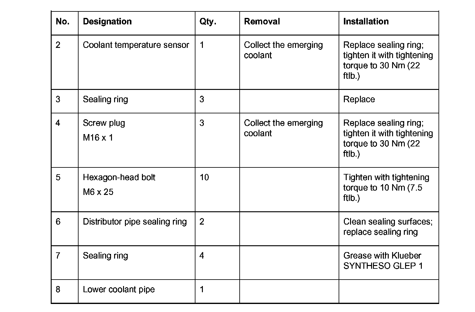 1. Clean sealing surfaces and screw in coolant temperature sensor with a new sealing ring into the distributor pipe with a tightening torque of 30 Nm (22 ft. lbs.).