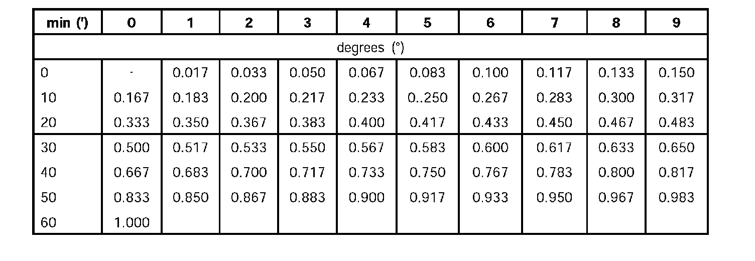 ^ Example 1: toe 17 min (17') = 0.283 decimal degrees according to table. Procedure for this: The imaginary line starting at the top of the 7-min column moving downwards and the line starting on the left in the 10-min row moving right meet at point/column 0.283.