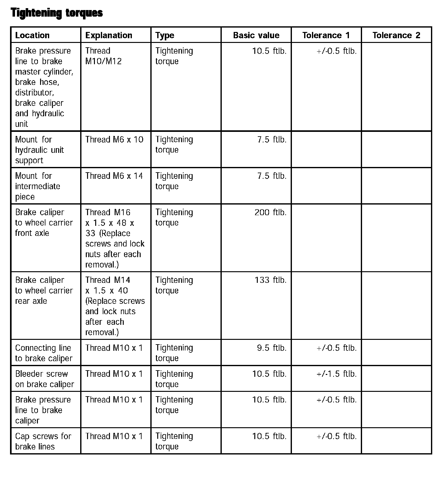 Tightening torques for brake hydraulics