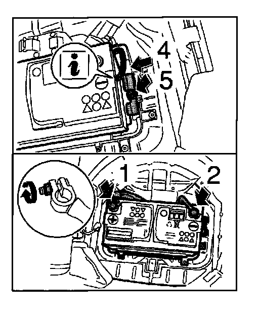 1. Risk of short circuit! First disconnect negative cable -1-, then positive cable -2-.