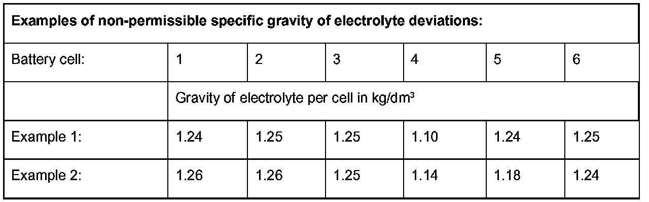 Example 2: The gravity of electrolyte in cells 4 and 5 is too low. The specific gravity of electrolyte deviations between the battery cells is greater than 0.03 kg/cu.dm.