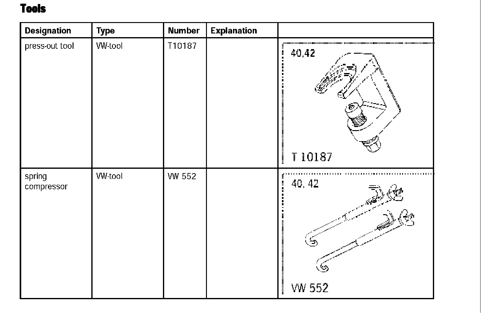 2. Fix upper axle strut -Inset 1- with spring compressor VW 552. This involves tensioning axle strut slightly because top ball joint can otherwise get damaged. When doing this, the -Spring compressor- is pushed through the hole in the axle strut, engaged in the upper opening of the wheel well (double panel) and in the axle strut and tightened with the nut.