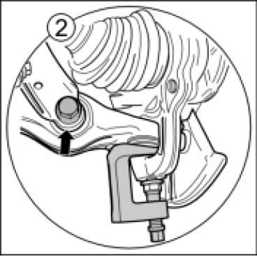 3. Loosen the fastening nuts - from the bottom ball joint and press off with the press-out tool T10187. When doing this, leave fastening nut flush on ball journal, so as not to damage thread.
