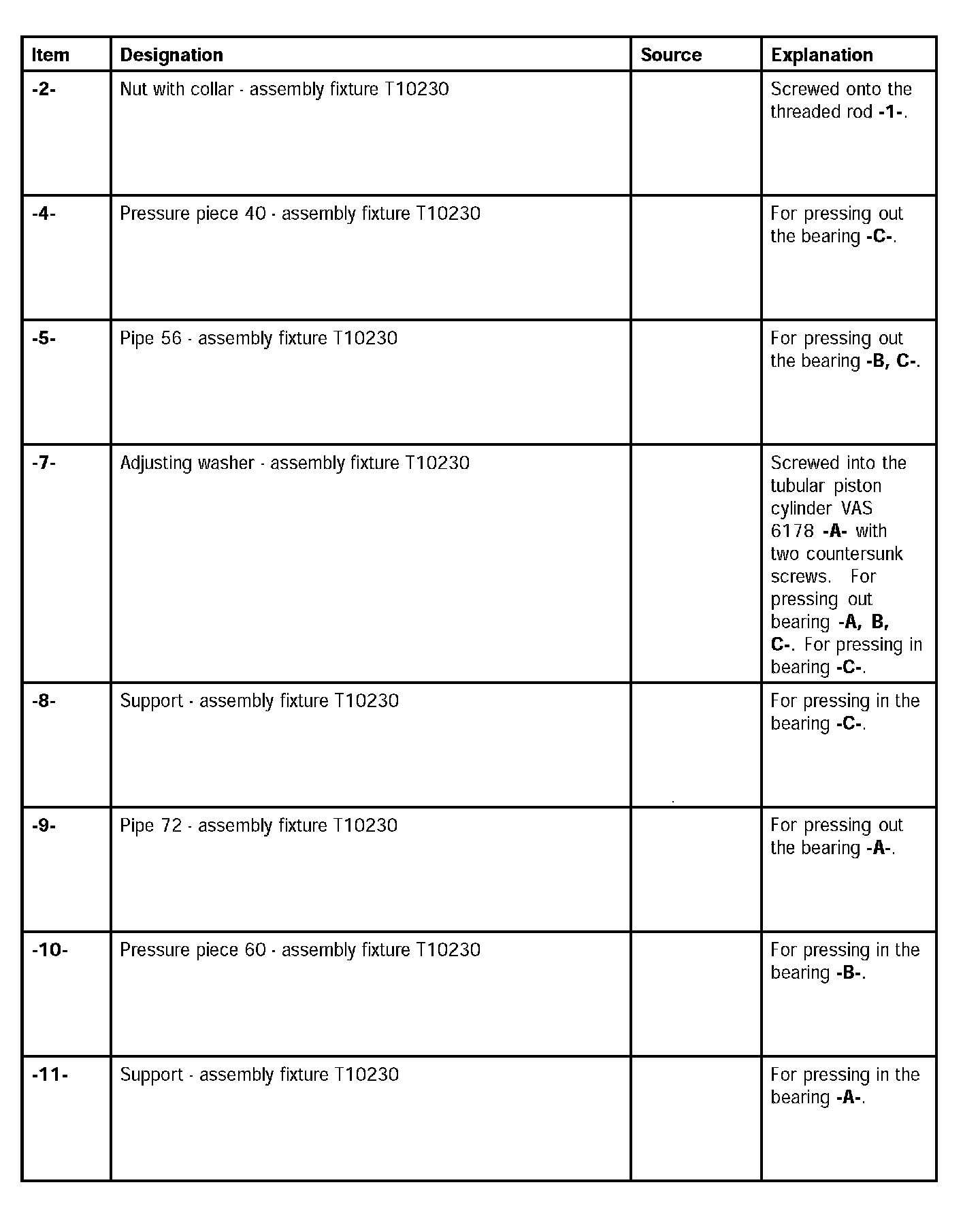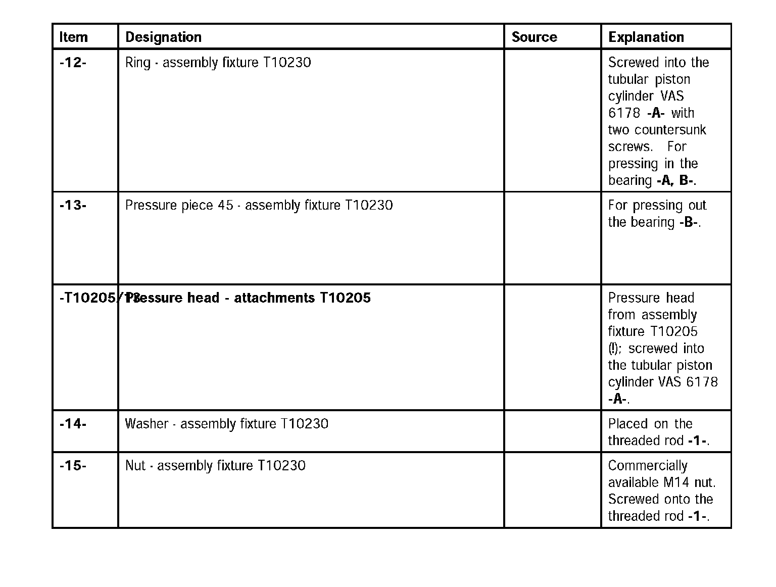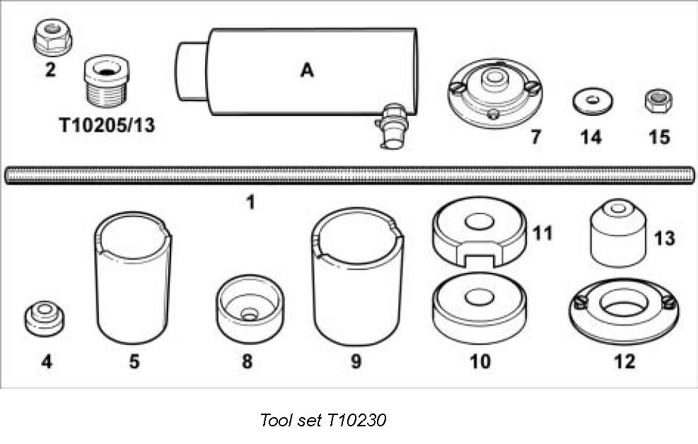 The pressure pieces and the tubular piston cylinder VAS 6178 are used for removal. This involves screwing pressure head T10205/13 into the tubular piston cylinder. T10230/2 is screwed on to the threaded rod and positioned in T10205/13 for pressing bearings in and out. Nut T10230/15 and washer T10230/14 are screwed onto the opposite end of the threaded rod.