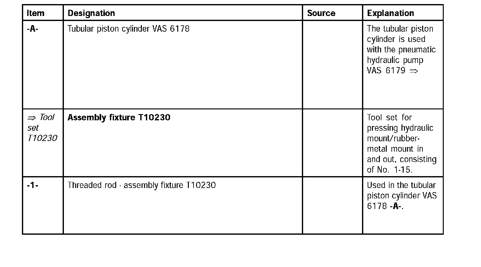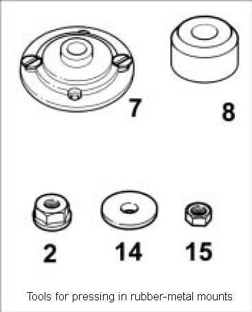 The pressure pieces are used as follows Arrangement of tools for pressing in hydraulic/rubber-metal mounts.