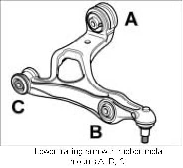 Lower trailing arm with rubber-metal mounts A, B, C.