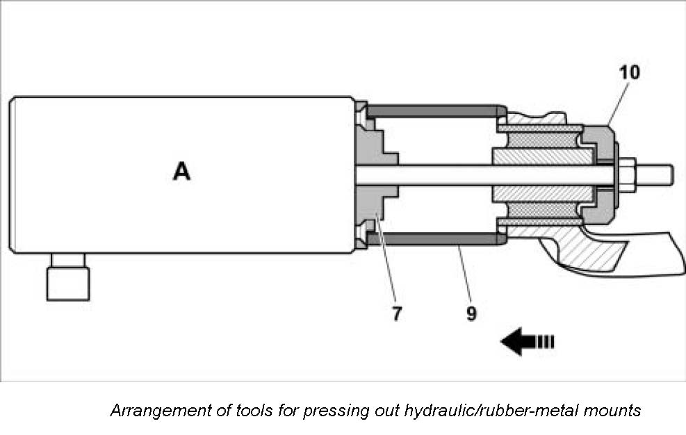 ^ Arrangement of tools for pressing out hydraulic/rubber-metal mounts.