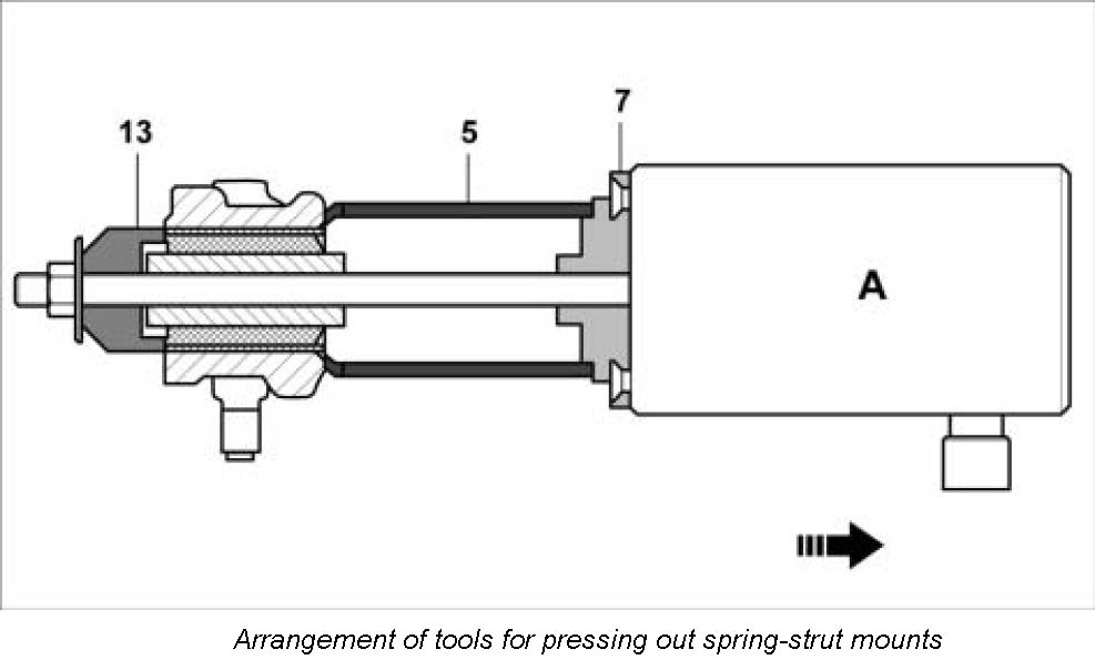 The pressure pieces are used as follows Arrangement of tools for pressing out spring-strut mounts.