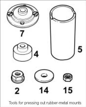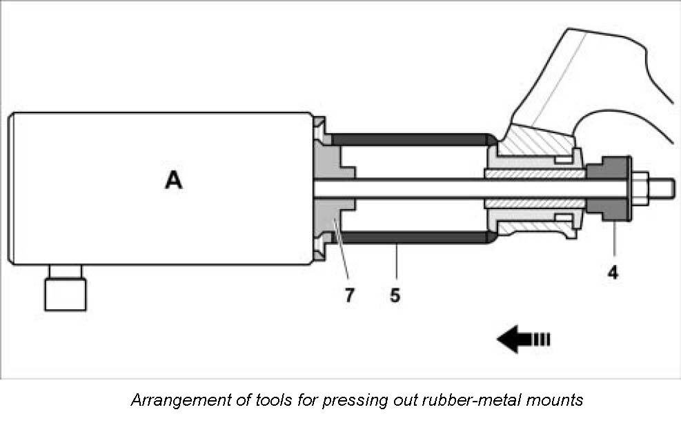 The pressure pieces are used as follows Arrangement of tools for pressing out rubber-metal mounts.