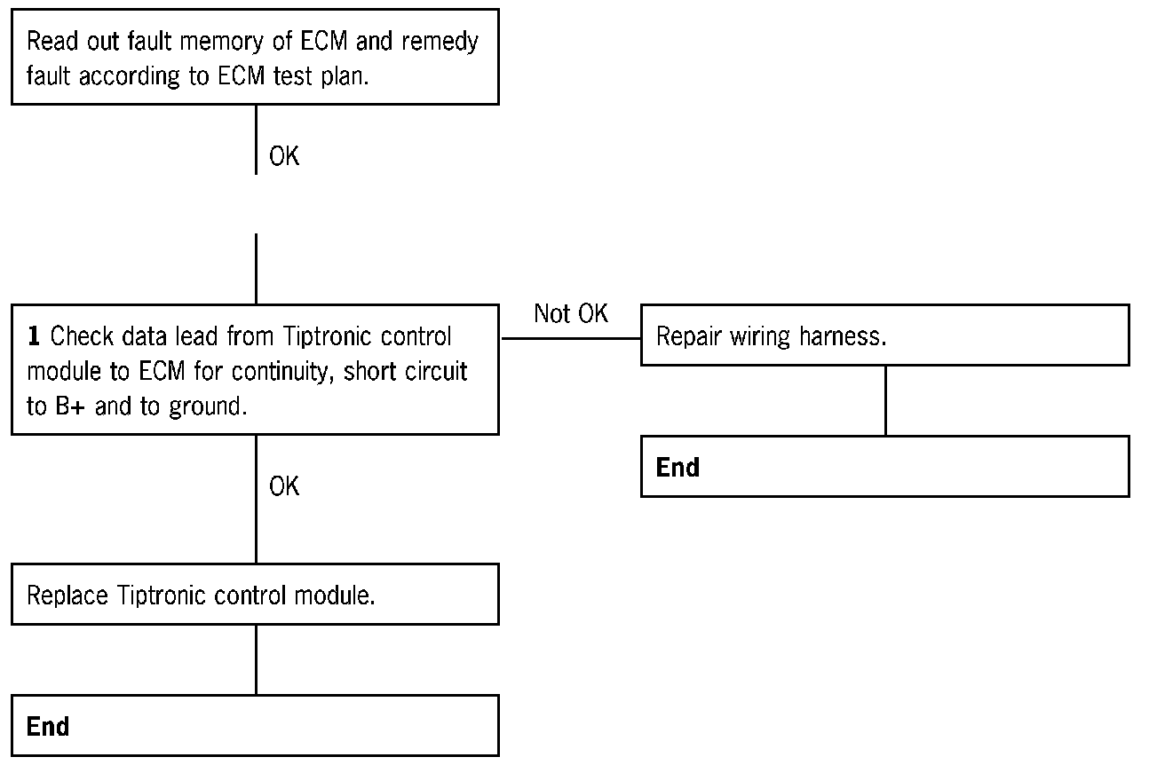 1 Check data lead from Tiptronic control module to ECM for short circuit to ground.
