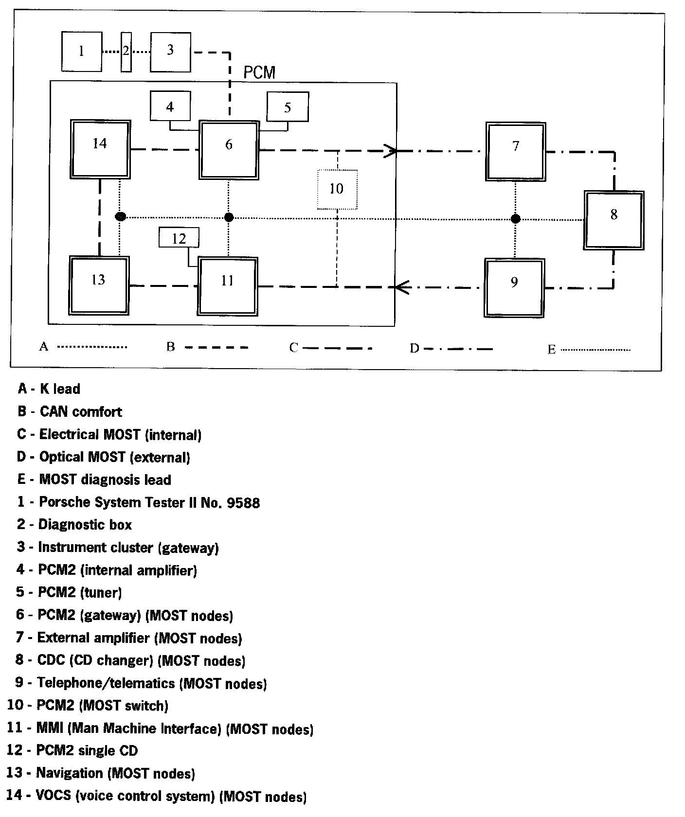 The PCM2 consists of at least two but a maximum of four MOST nodes, (Gateway, MMI and Navigation and VOCS (optional)), which communicate with each other electronically via the MOST. Data is transferred outside of the PCM2 via the optical MOST.