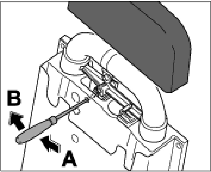 Insert a screwdriver into the hole in the module and press it against the top edge of the pawl. Press the screwdriver to the right -arrow A- and hold it while pressing up in direction of arrow -arrow B-. The roll-over protection system is released.