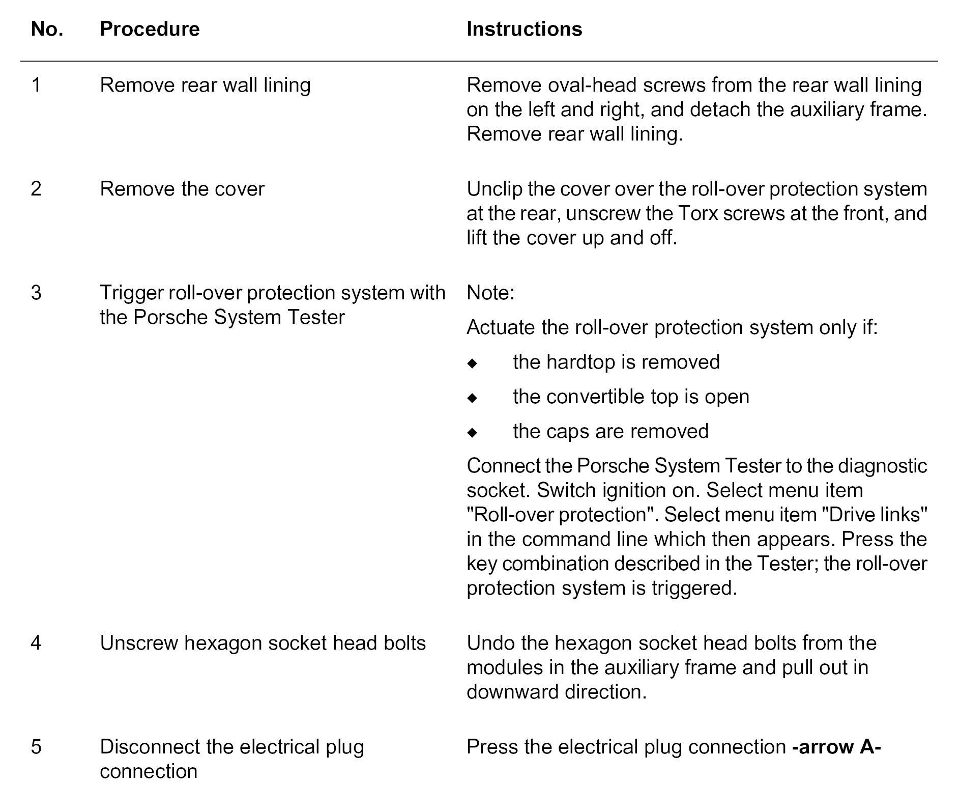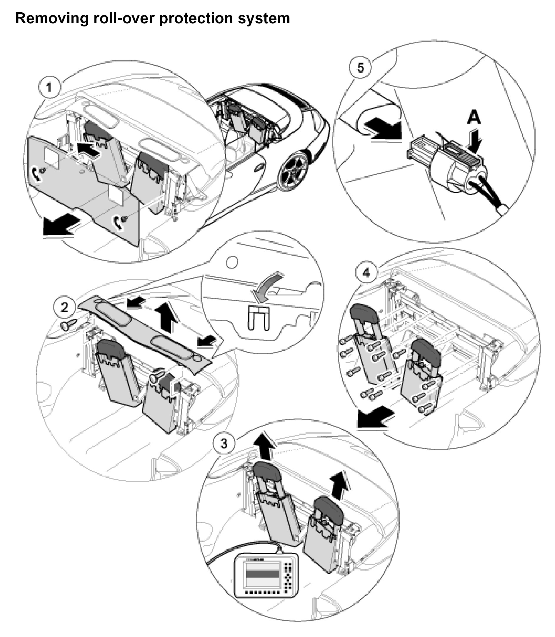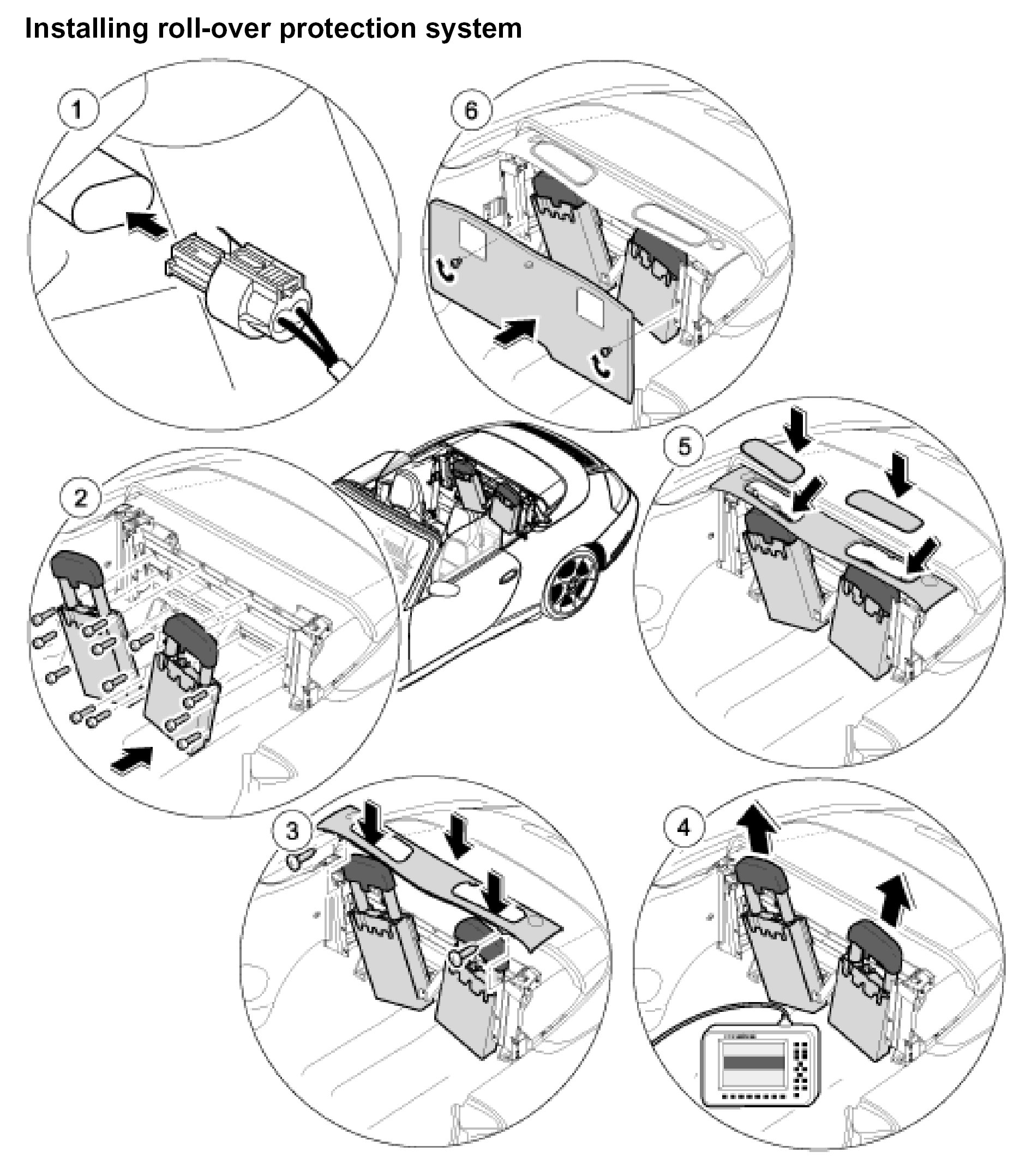 - After assembly work on the roll-over protection system - but at least every 2 years - the function of the roll-over protection system must be tested by triggering it via the diagnostic interface of the Porsche System Tester.