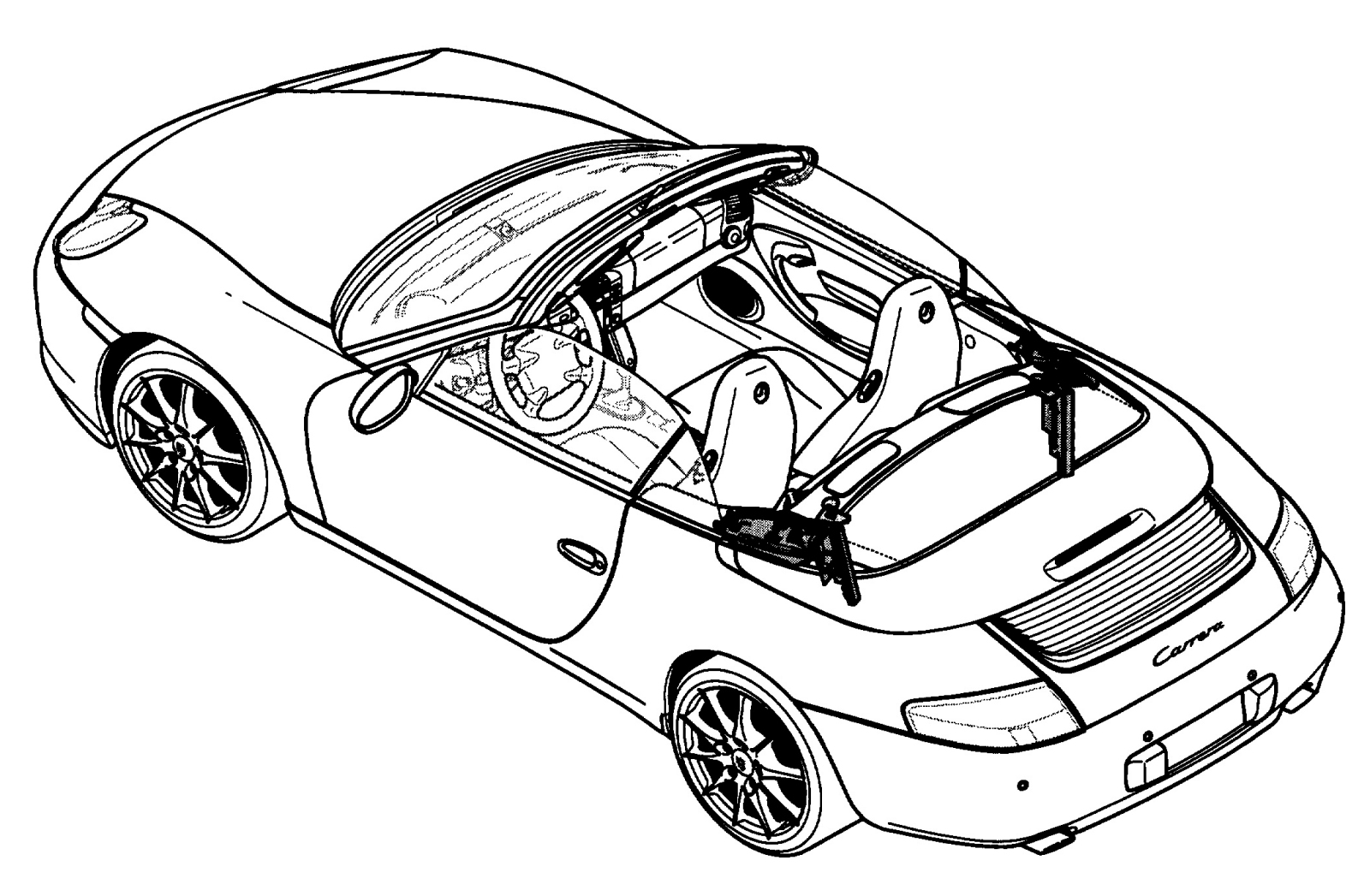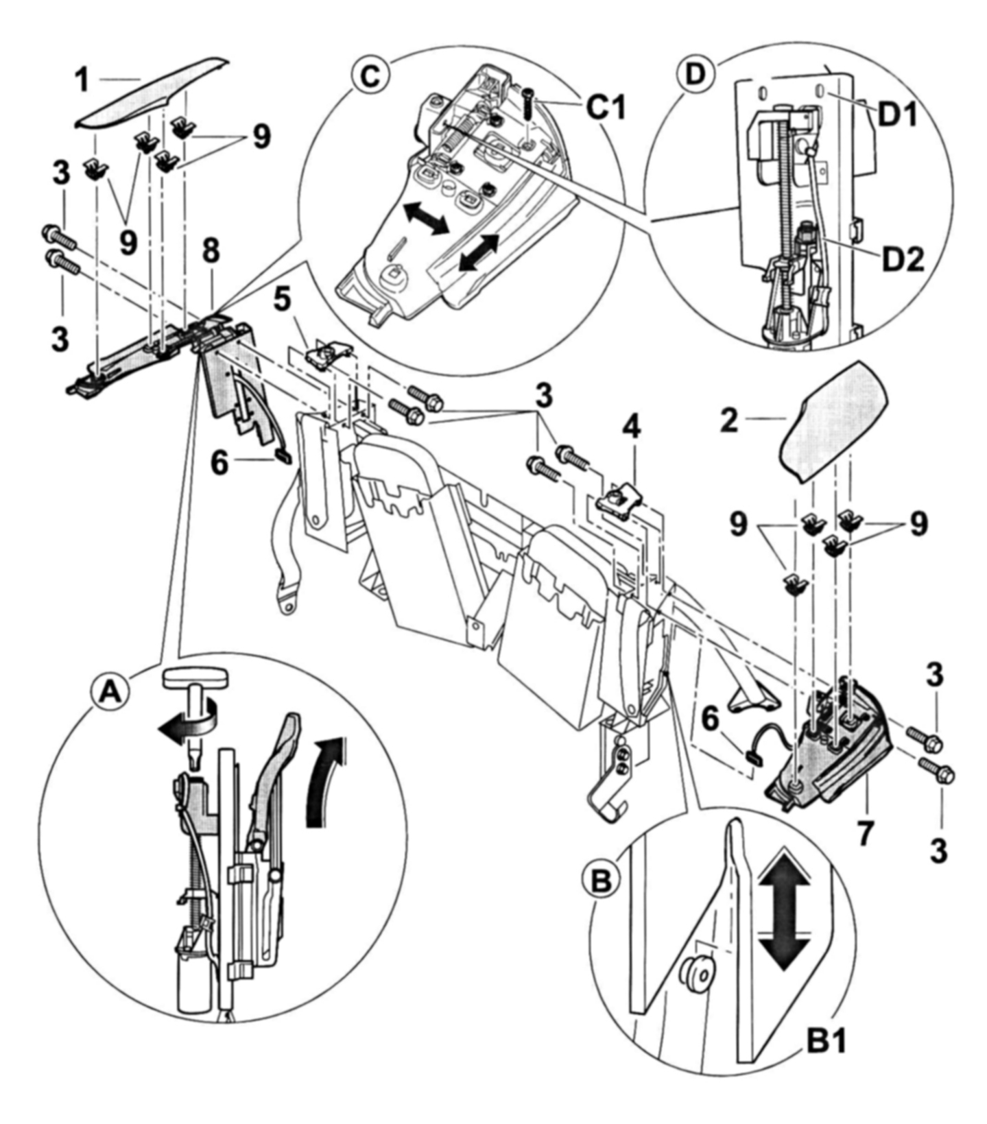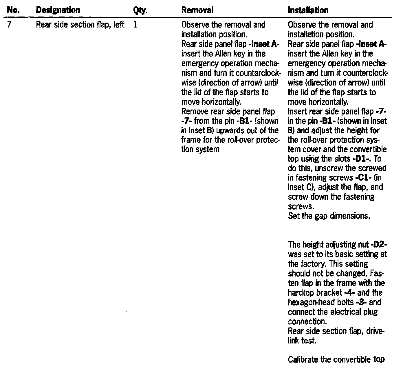 (Convertible top open and set down.) Insert a plastic spatula under the trim and press it out. The height adjustment is made using the Torx screws -D1- in the flap.