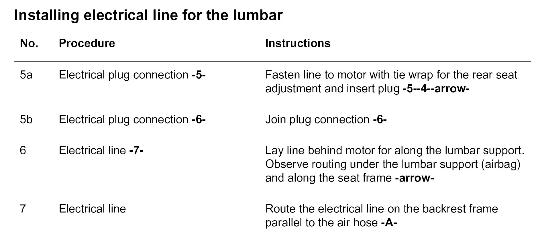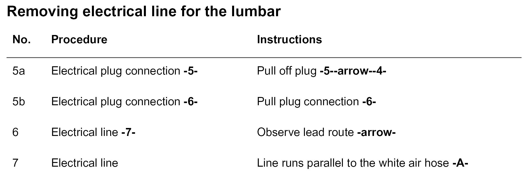 In the case of the complaint "lumbar support does not function", proceed according to the following work instruction. As the seat functions vary, the test plan principally complies with the seat version with seat memory adjustment. Work aids: Use wiring diagram and multimeter.