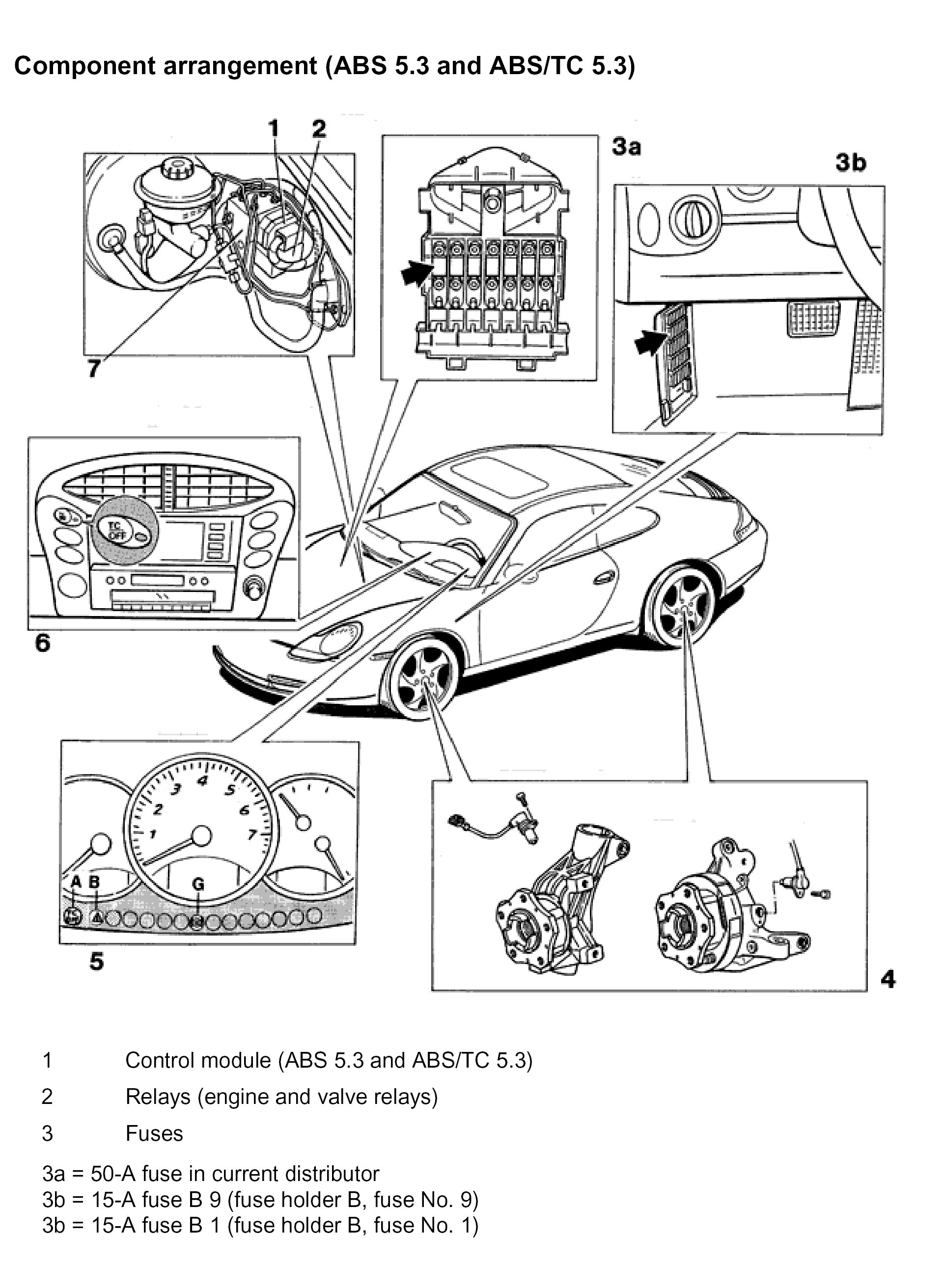 ABS 5.3 is optimized with regard to installed volume and weight compared with the ABS 5 (ABS 5 on the 993). Control module (No. 1), hydraulic unit (No. 7), pump-motor relay and valve relay (No. 2) of ABS 5.3 and ABS/TC 5.3 form a unit that is located next to the brake master cylinder.