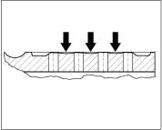 ^ In the presence of high pressure forces, at the innermost and outermost hole-free friction plate track -arrows-, the brake pad friction surface is the least worn, compared to the middle holed area. As a result, in the case of weaker braking, a relatively higher amount of pressing on the surface arises in these areas and therefore greater wear of the friction plates. The natural balance between stronger and weaker braking ensures that in almost all cases the typical wear profile of a perforated friction plate arises (inner and outer smooth friction rim area) is the most worn -arrows-.
