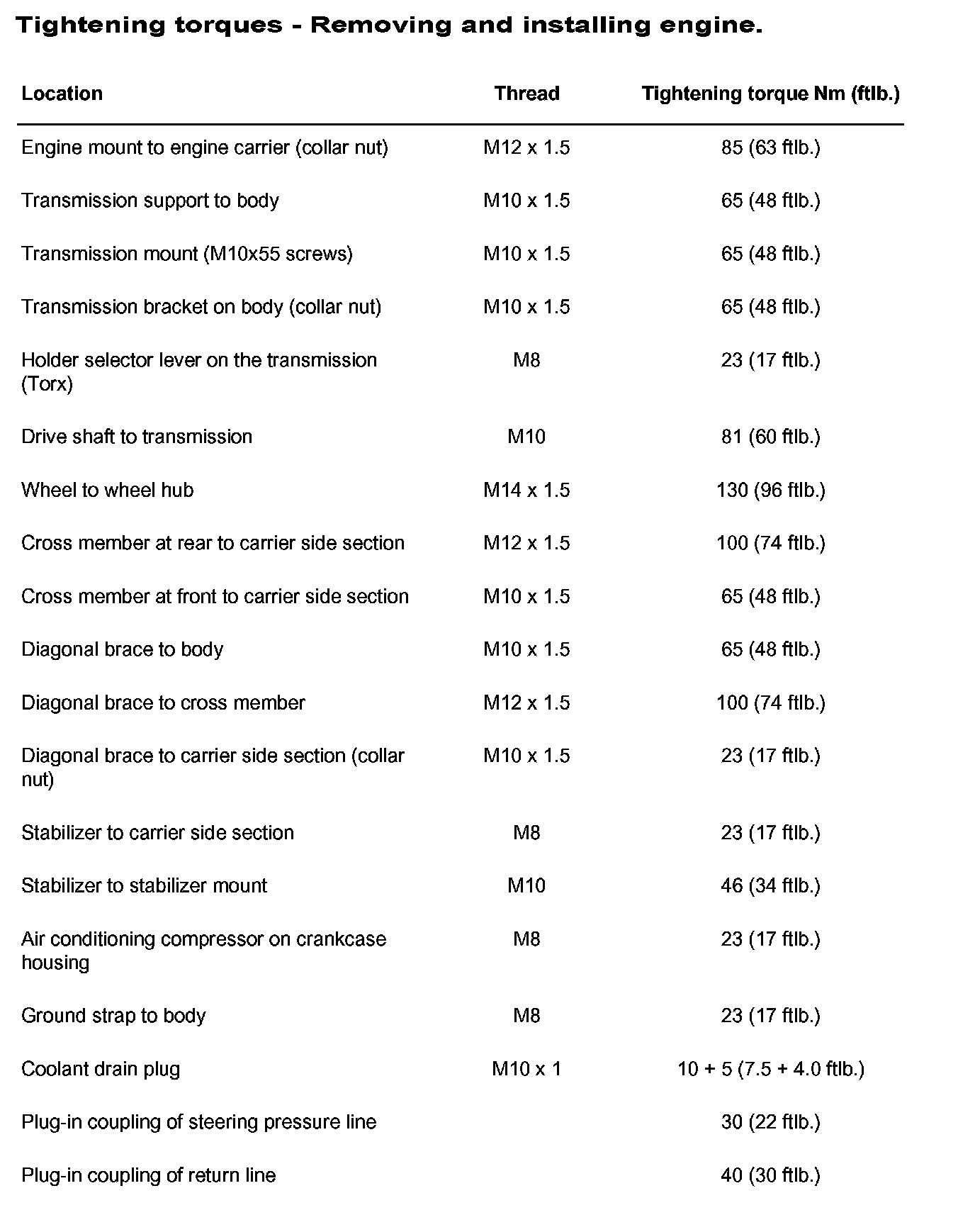 Tightening torque of engine mount to engine carrier : 85 Nm (63 ft. lbs.)