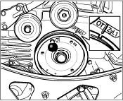 5. Turn the engine at the belt pulley of the crankshaft clockwise (engine direction of rotation) to the TDC marking (the TDC bore in the belt pulley is flush with the fixing bore in the crankcase). Fix with special tool fixing pins as of mod. 98 9595/1. Use short fixing pin.