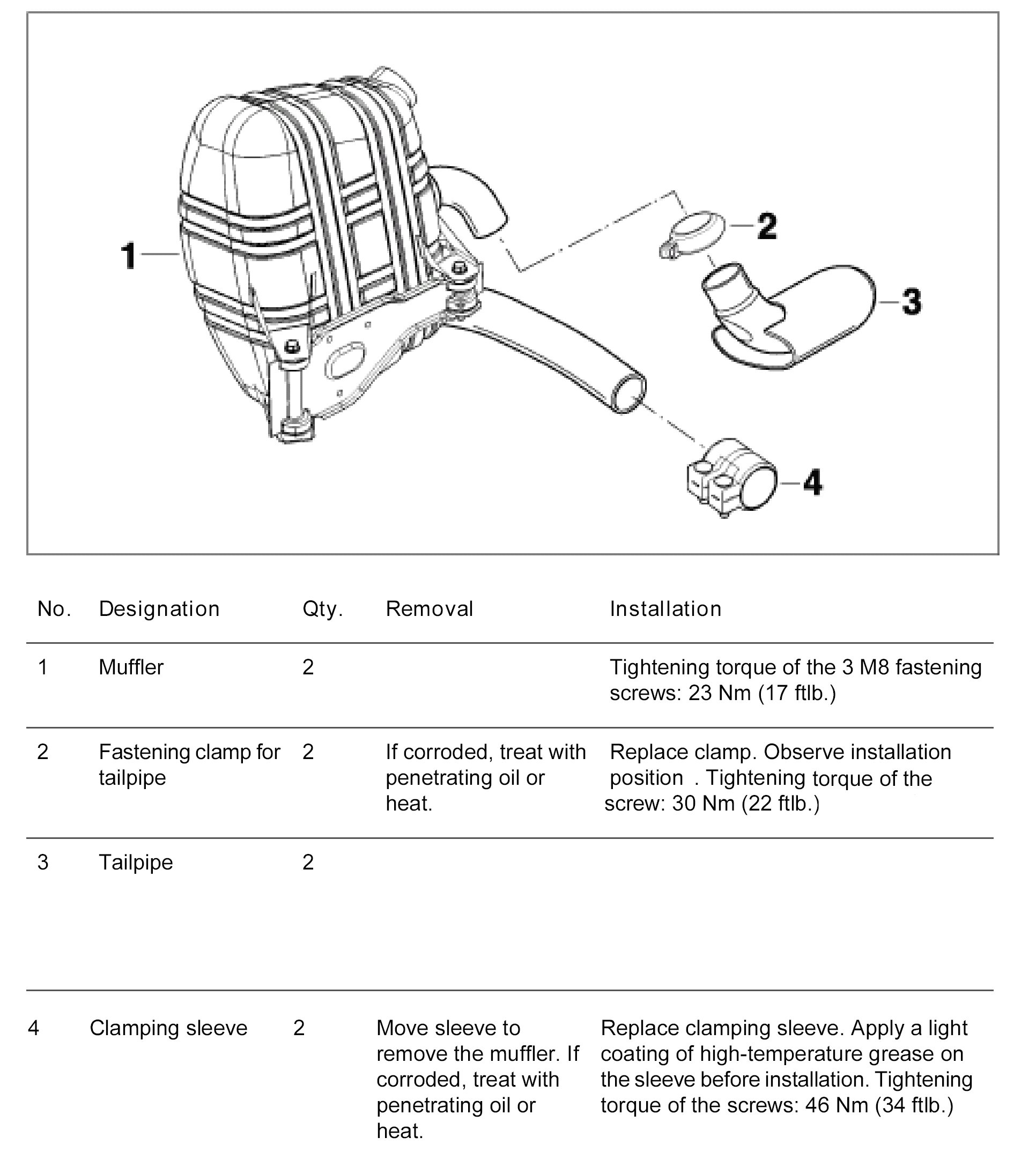 Tightening torque for the M8 hexagon-head bolts on the muffler holder: 23 Nm (17 ft.lb.)