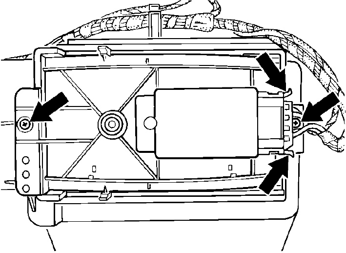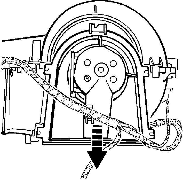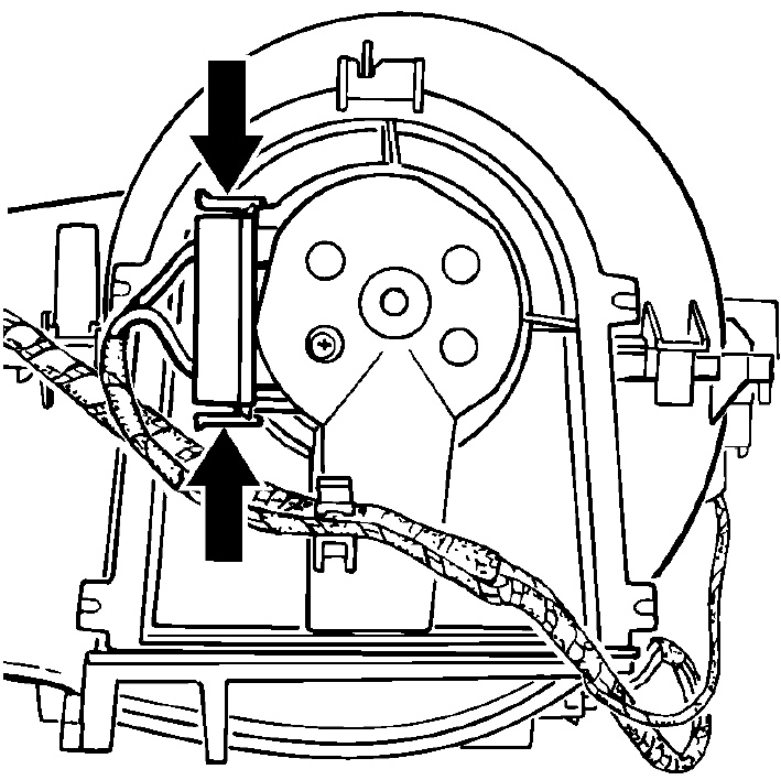 1. Remove footwell bulkhead and right air guide. Pull off electrical plug connection on the blower motor and remove wire from the holder. The figure shows the heating/fresh-air unit when removed.