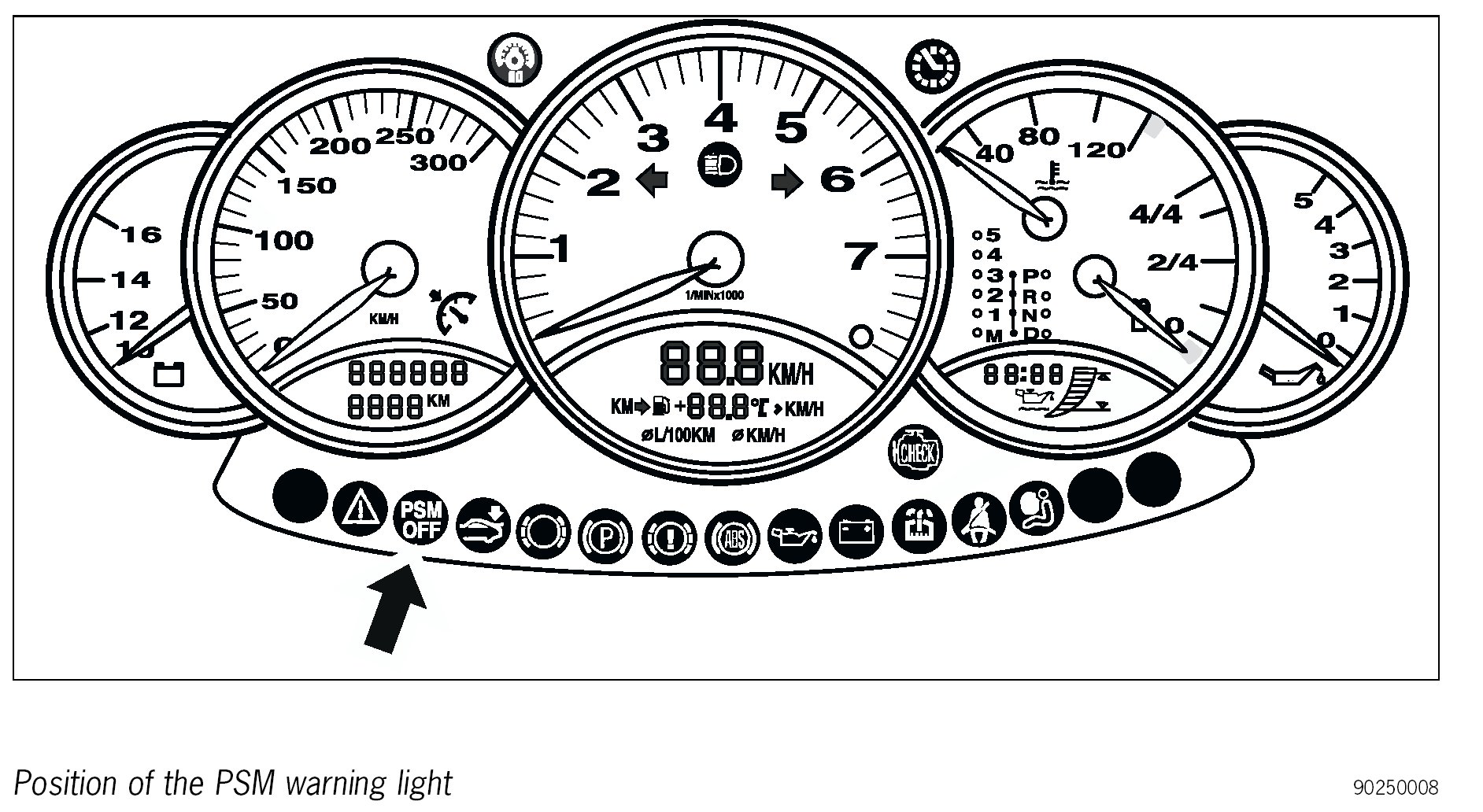 Lights up as a check when the ignition is switched on together with the rocker switch. During the journey, the warning light shows that the PSM system is switched off. It also lights up in the event of a defect in the PSM system.