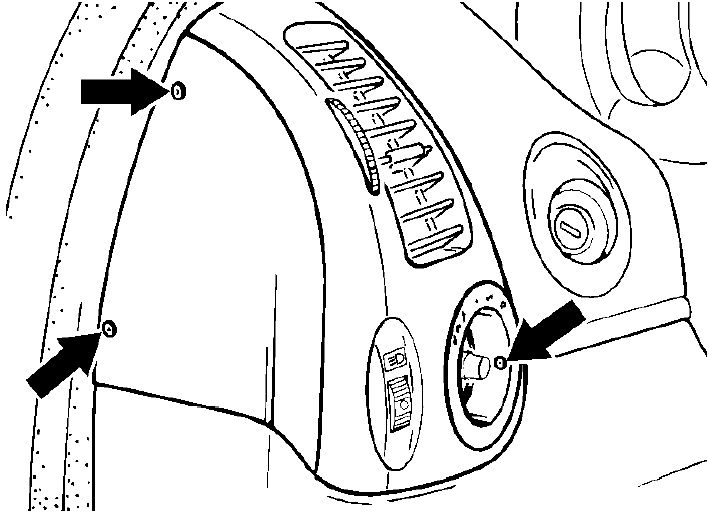 3. Undo three 4.0 x 18 Torx screws of the left side vent and carefully pull the side vent out of the dashboard. One Torx screw is located in the light switch on the right.