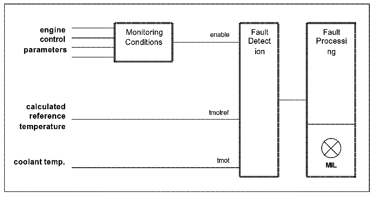 Due to a missing or stuck open thermostat the cooling temperature rise is delayed, especially at low ambient temperatures. The picture below shows an overview of the monitor. The thermostat monitor is designed to detect a delay in the warming up of the engine coolant temperature. Therefor the calculated reference temperature (based on coolant temperature at maximum heat radiation with functioning thermostat) is reused. At enabled monitoring conditions the difference between the calculated reference temperature and the coolant temperature is checked. If the difference is above a calibrated threshold for a calibrated period of time and the calculated reference temperature has not yet reached its maximum value, the fault is detected and its fault code is set. If the difference remains below the calibrated threshold for a time period longer than the above mentioned time an error from a previous warm up cycle may be cleared as soon as the calculated reference temperature has reached its maximum value.
