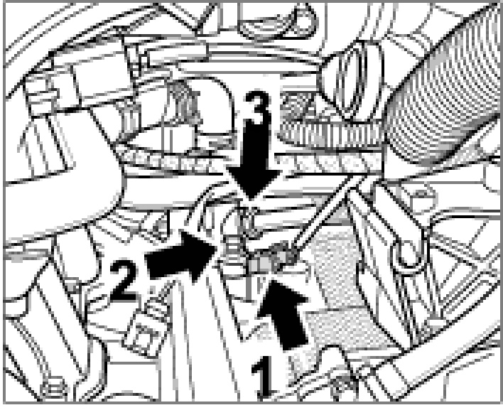 13. Remove the cable plug of the knock sensor (cylinder bank 1 - 3) -1- and unscrew the M8 hexagon-head bolt of the knock sensor -2- ; then remove the knock sensor. Unscrew the air line union nut (hexagon a/f 22) -3- on the distributor housing.