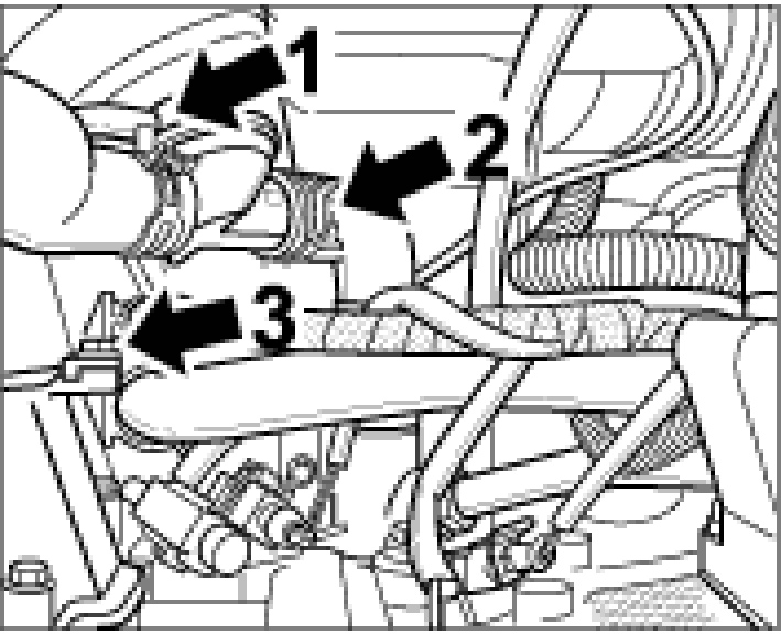 15. On cylinder bank 1 - 3, remove the wire retainer from the intake pipe -3- by unclipping the wiring harness and unscrewing the M6 hexagon-head bolt. Disconnect vacuum line from the anti-run-on valve -1-. Using spring-band pliers, remove the clamp from the hose to the secondary air pump -2- and pull off the hose.
