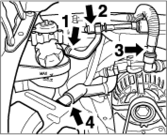 7. Remove coolant bleeder hose -arrow- by undoing the spring-band clamp and then pulling off the hose. Collect any draining water.