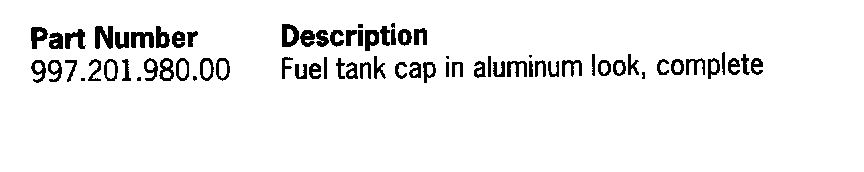 For the above-mentioned vehicles, a optional fuel tank cap is offered (in Tequipment catalog: "Tank-cap lock in aluminium look") (Figure 001). The fuel tank cap with Porsche logo, 5 holes in handle, and 6 allen head bolts is reminiscent of fuel caps found on race cars.