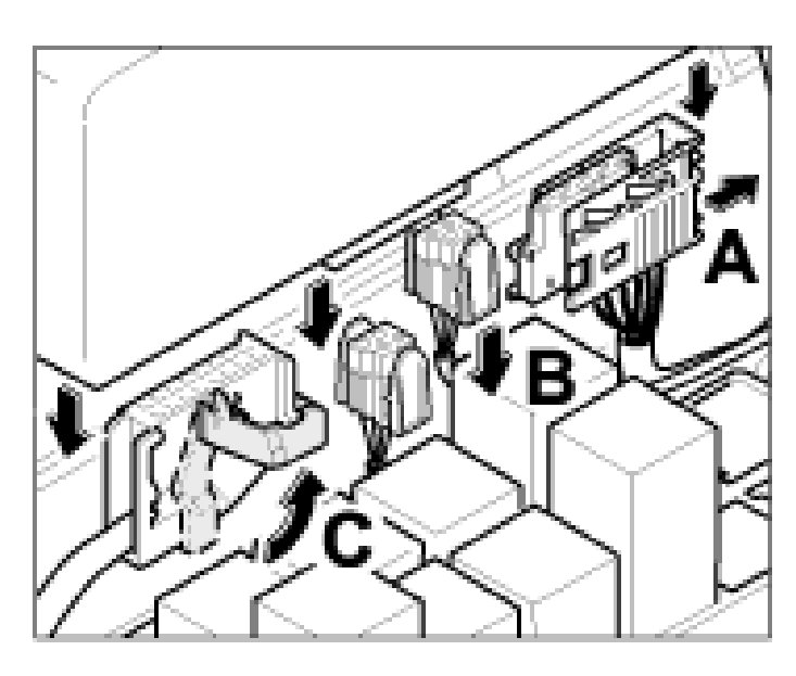 1. Join electrical plug connections -arrow C- and engage the locking lever downward. Join plug connection -arrow B-. Join plug connection -arrow A-, and press the connector housing to the left until it engages. Lay lines carefully (do not trap).