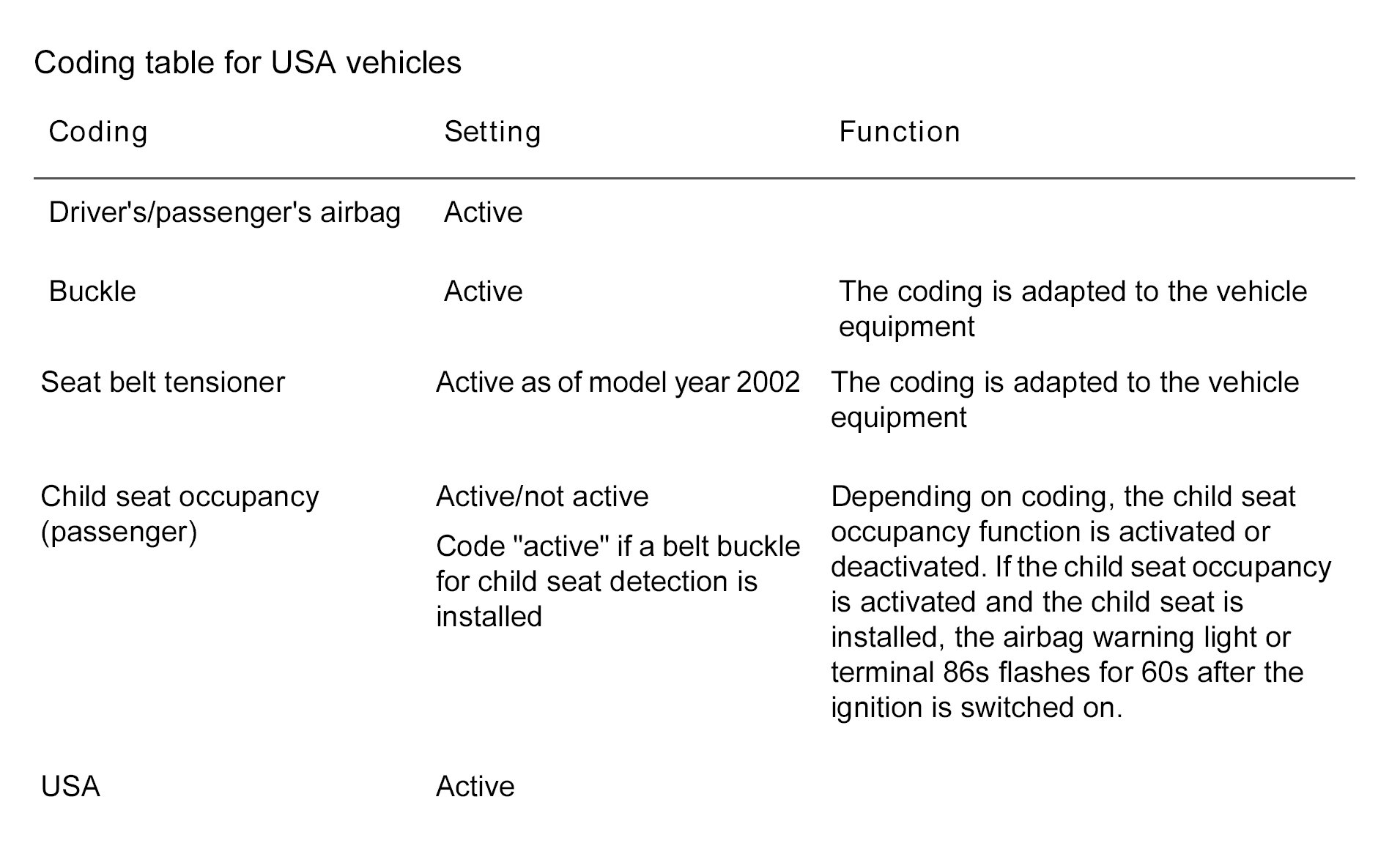 Coding table for USA vehicles