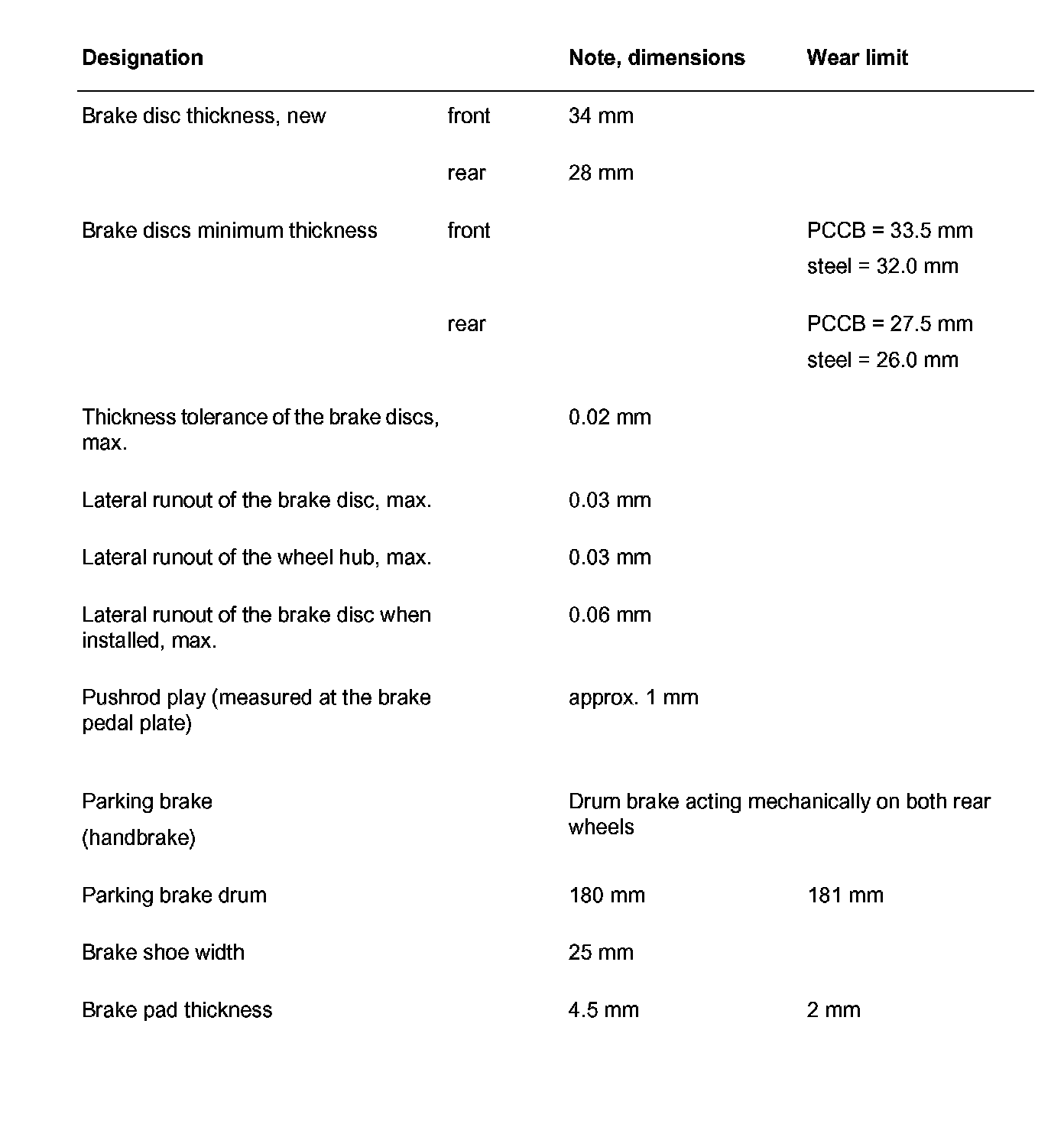 Technical Data/Wear Limit Brake - GT3 RS and GT3 As of Model Year 2004