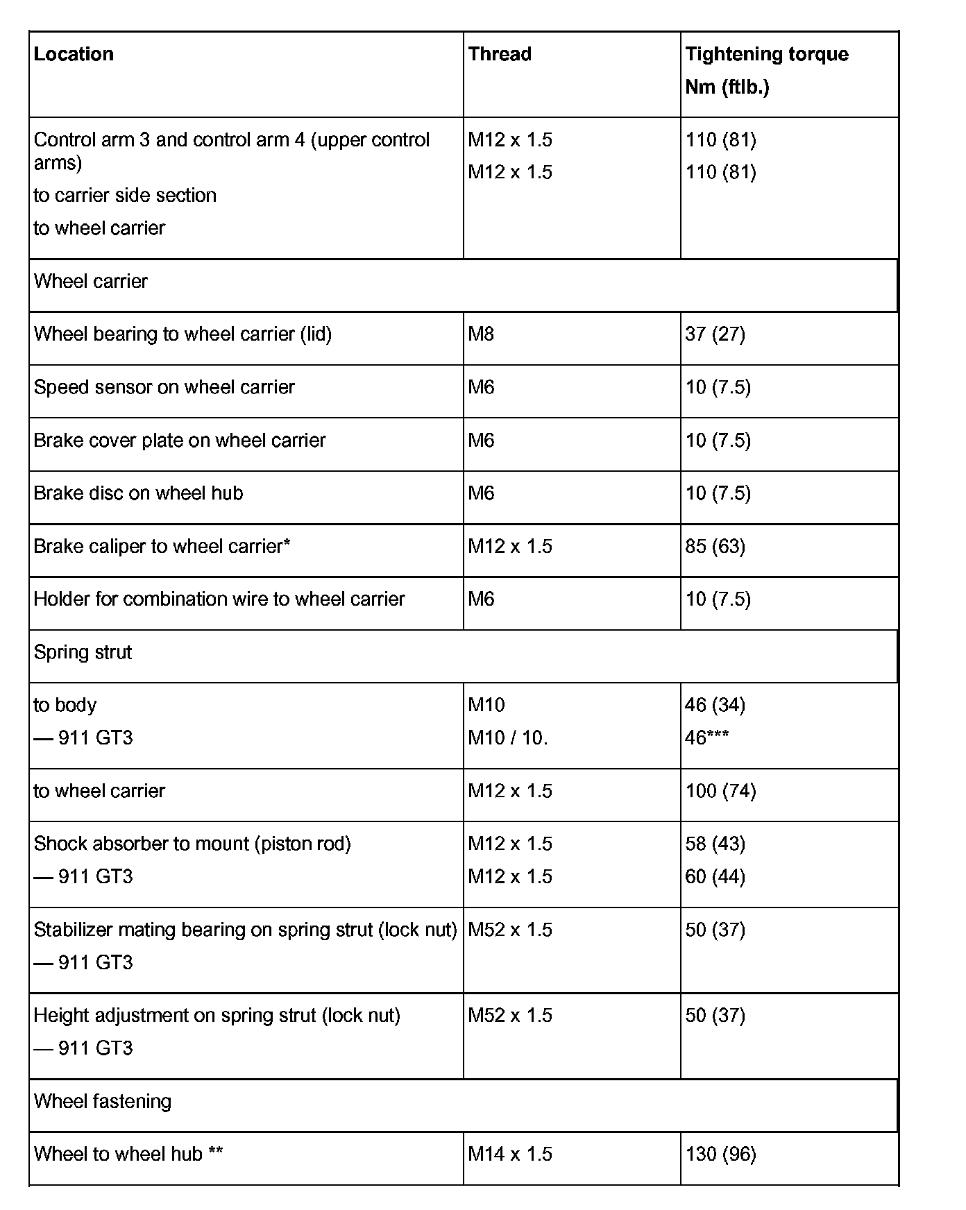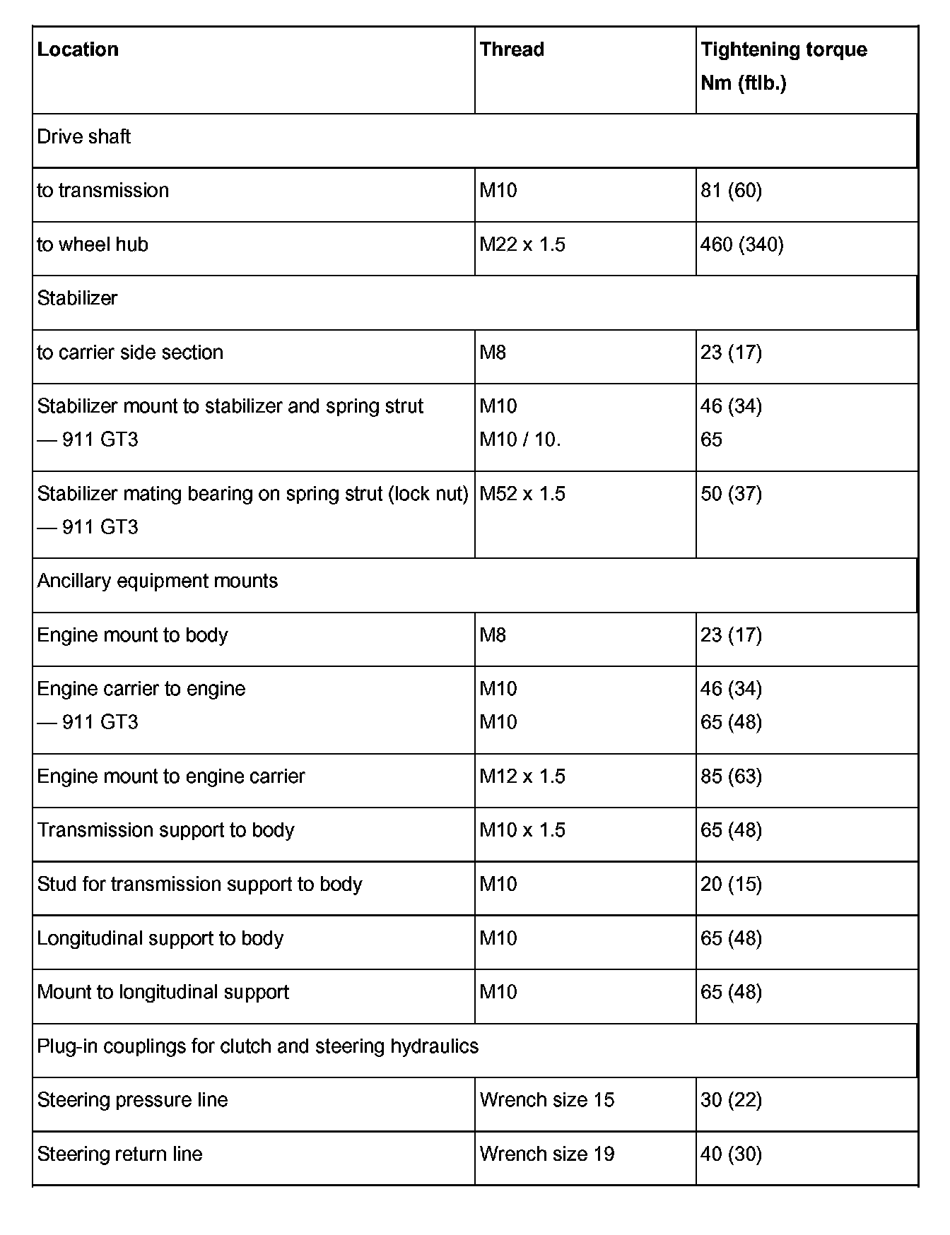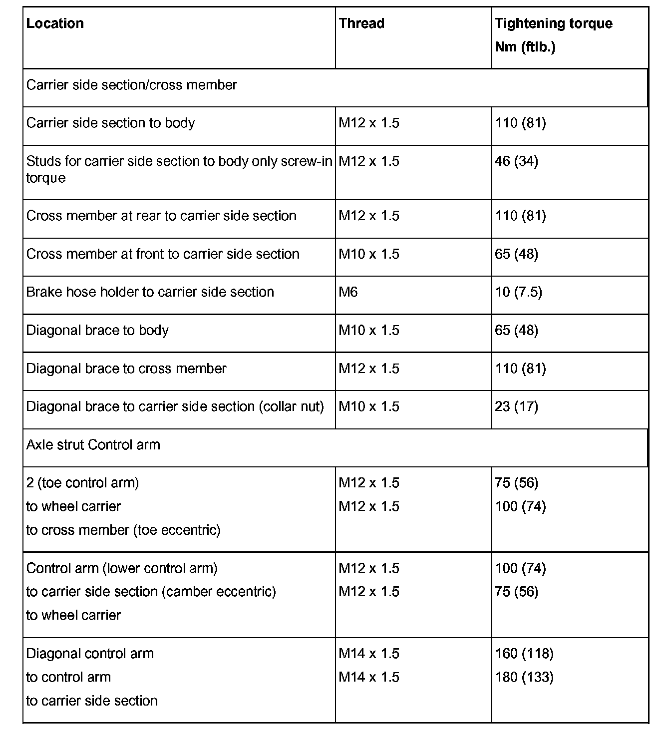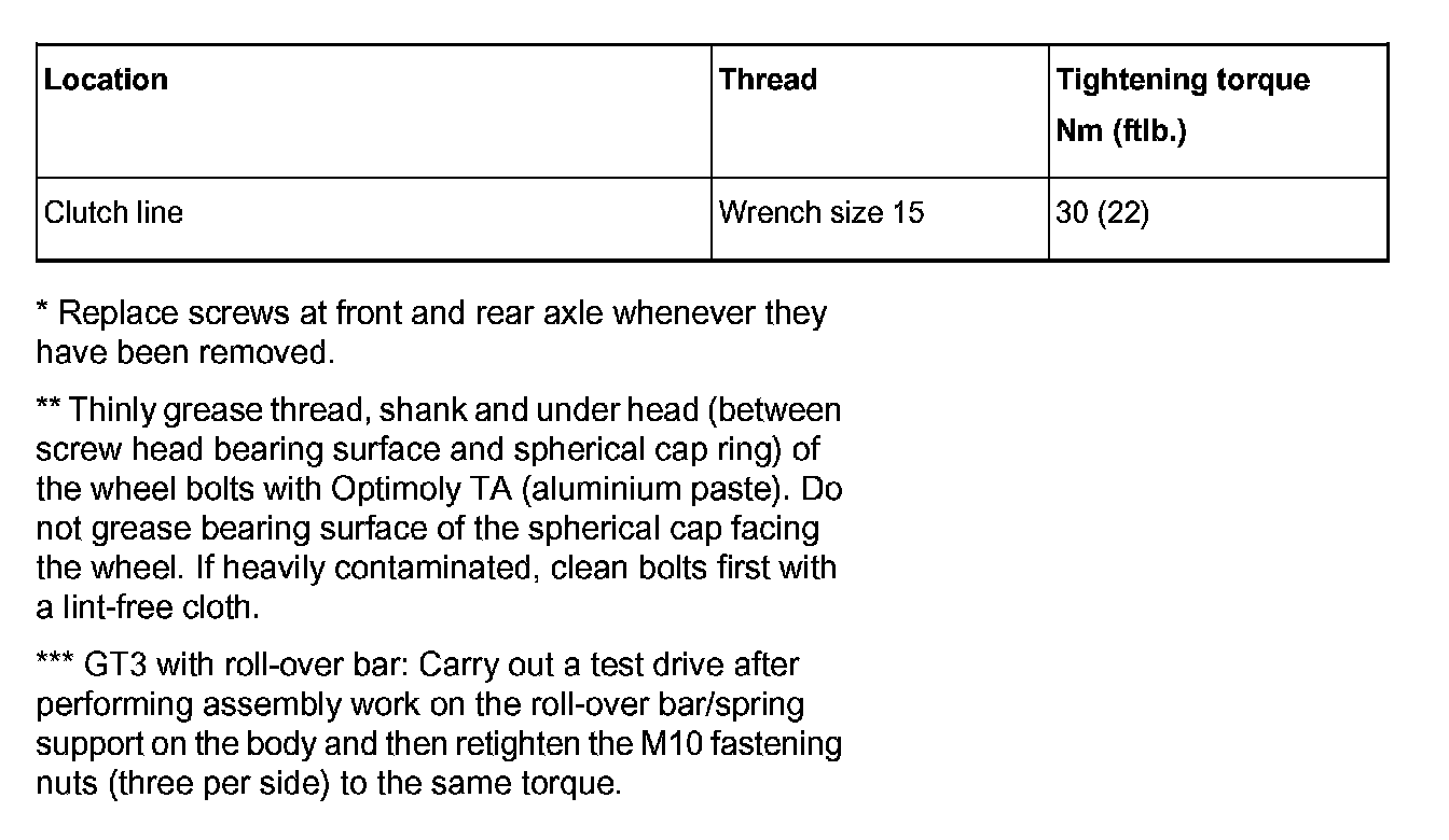 Tightening torques for rear axle