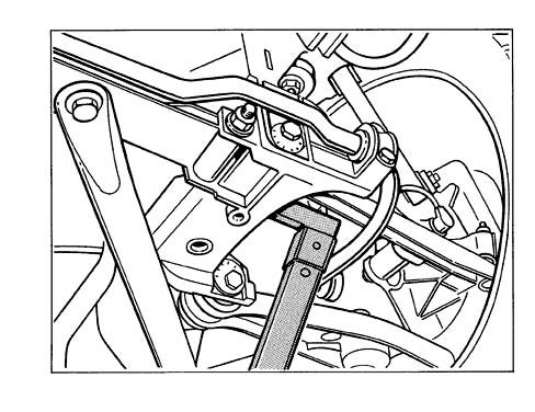 ^ Use special tool 9626 in combination with a torque wrench to loosen and tighten the lock nuts of the toe and camber eccentrics. The prescribed lock nut tightening torque of 100 Nm (74 ft. lbs.) also corresponds to a setting on the torque wrench of approximately 100 Nm (74 ft. lbs.).