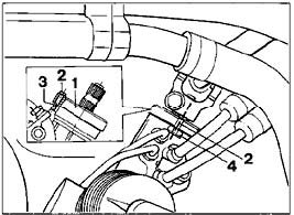 No. 3 is the desired breaking point for pins in new steering gears. (New) pin No. 2 is inserted into driver No. 1 and lies with its underside within the recess of lug No. 4. This locks the steering gear in the centre position. After installation of a new steering gear, the lower part of the pin is sheared off (at the desired breaking point No. 3) by turning the steering wheel. The upper part of the pin remains in the driver.