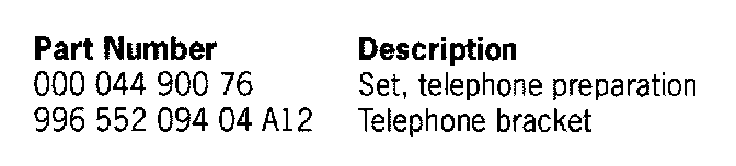 Telephone preparation for mobile telephones contains an antenna integrated in the radiator tank, various wires, a microphone, as well as a bracket for the mobile telephone holder. The hands-free microphone must be set to the type of mobile phone (see Technical Manual, Group 9, Part ID. 9157).
