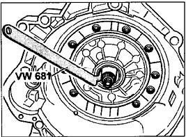 2. Remove sealing ring with special tool VW 681. Place the special tool directly behind the sealing lip of the sealing ring so that the mounting-face ring is not damaged.