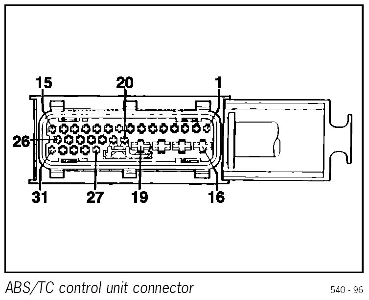 2. Connect ohmmeter to Tiptronic control module connector connector pin 38 (or pin 39) and ABS/TC control unit connector pin 25 (or pin 26).