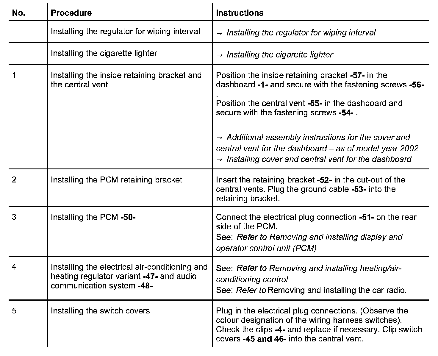Additional assembly instructions for the cover and central vent for the dashboard - as of model year 2002