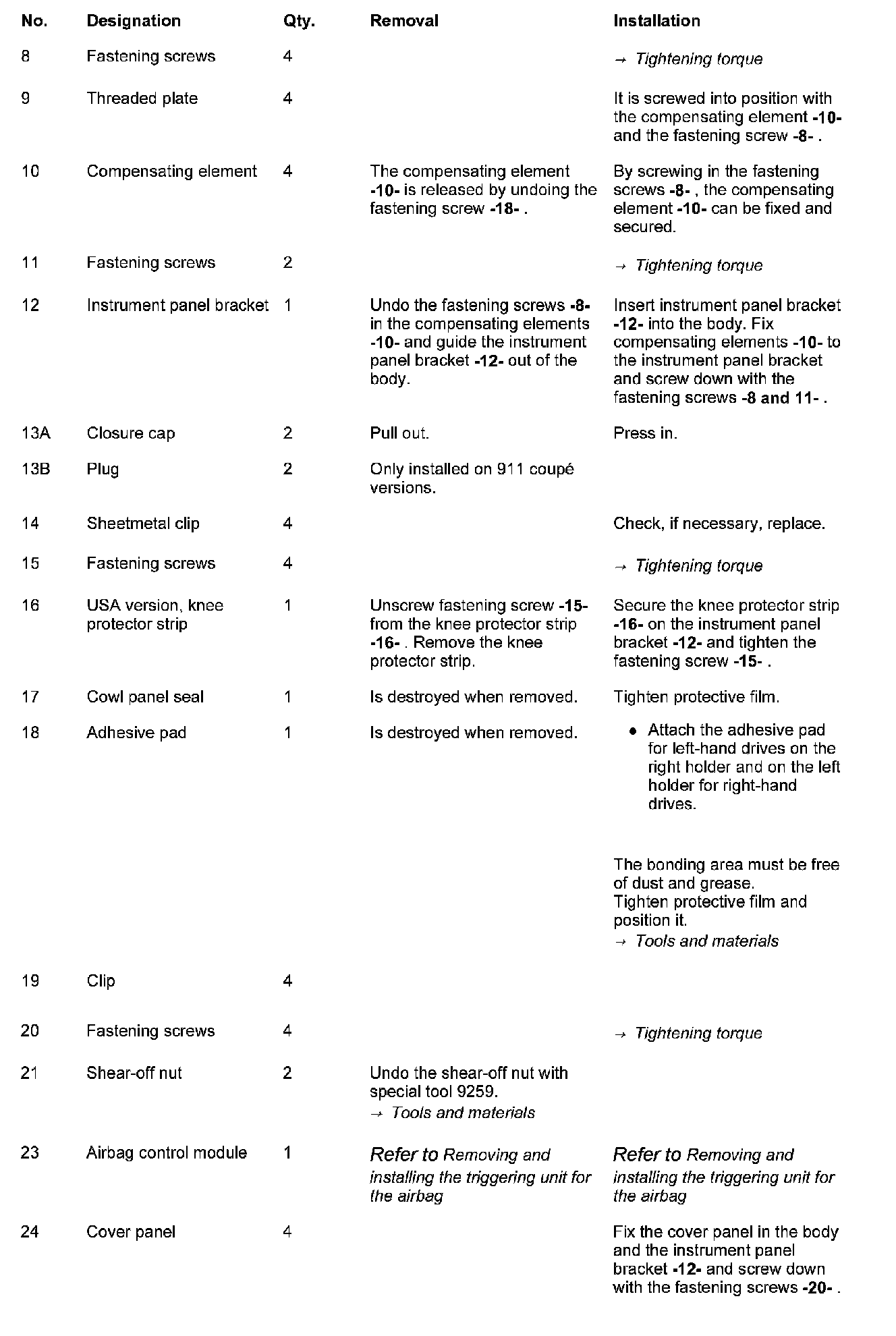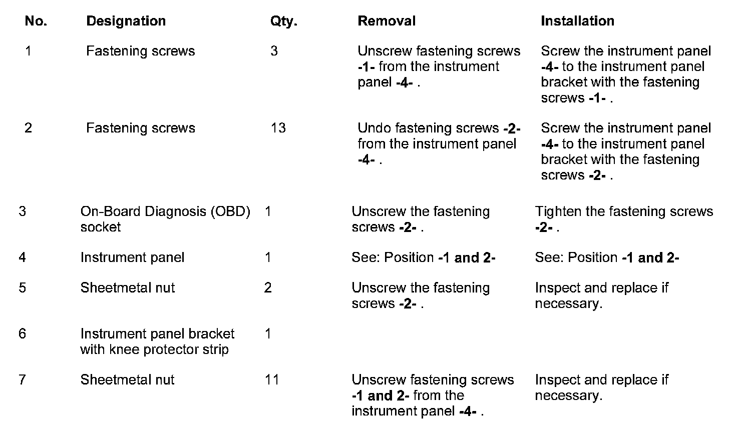 Removing and installing the instrument panel