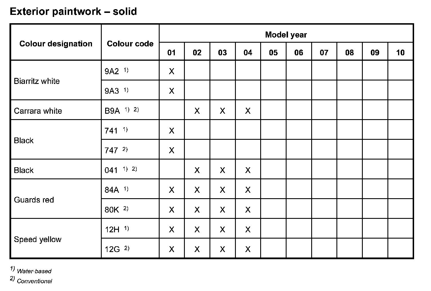 NOTE: As from model year '02, the same colour code will be used for water-based paints and for conventional paints.