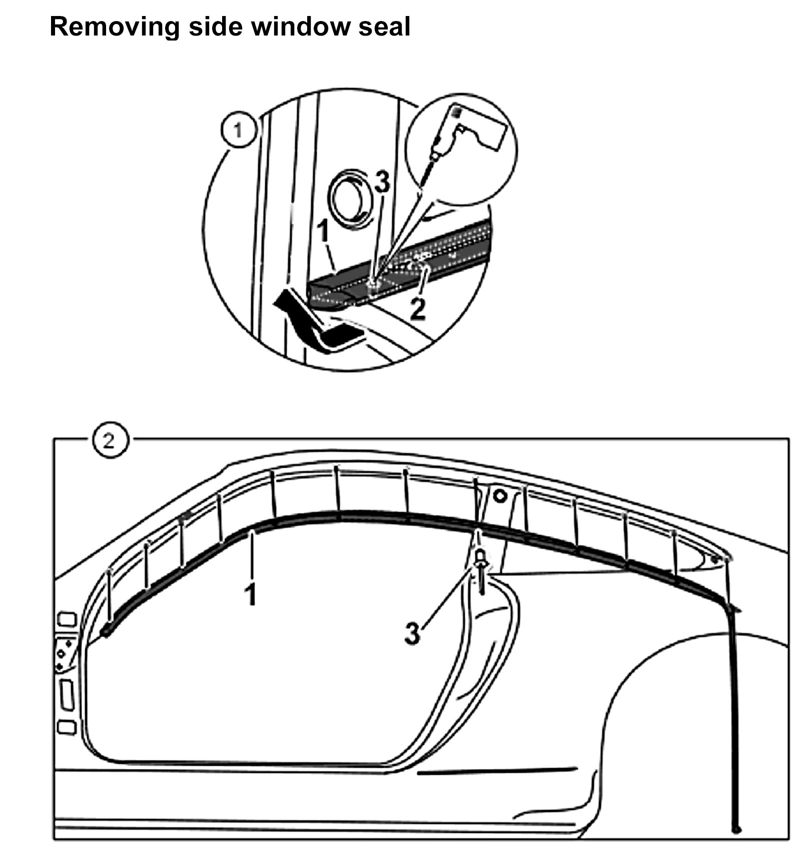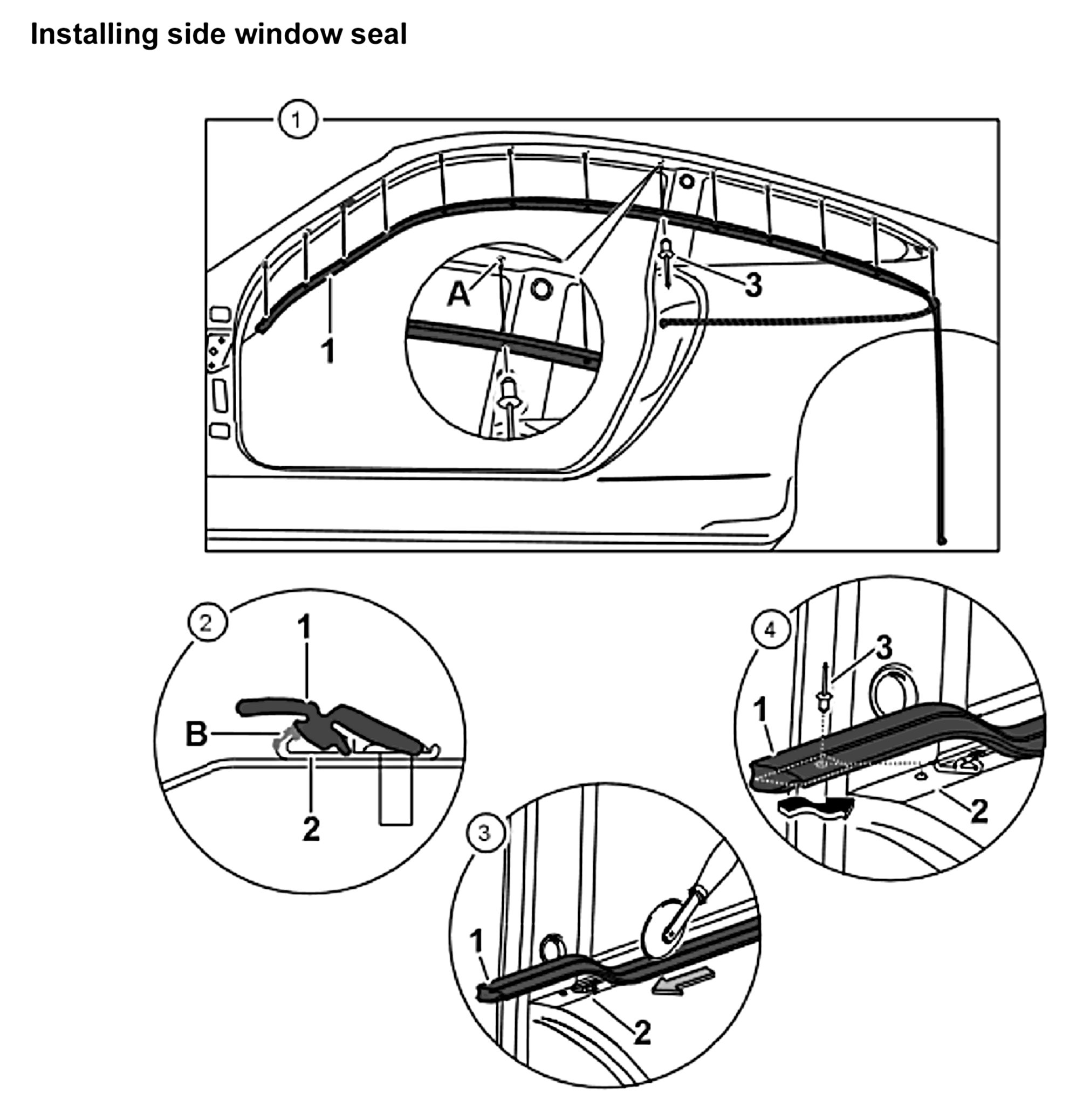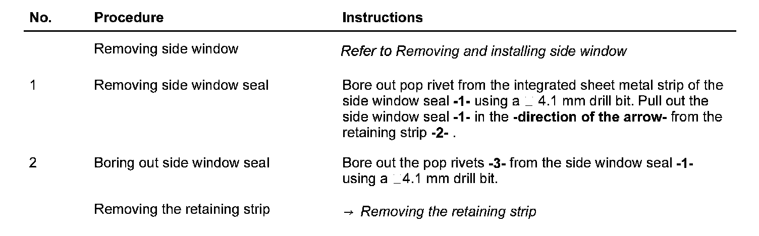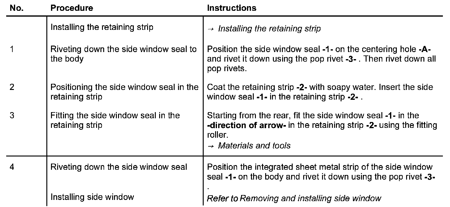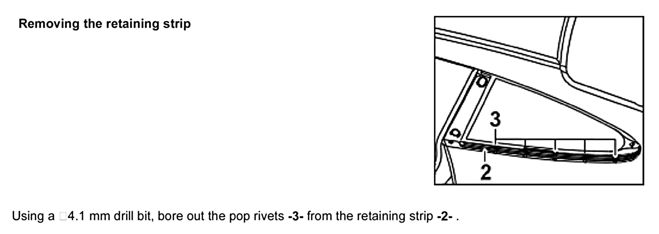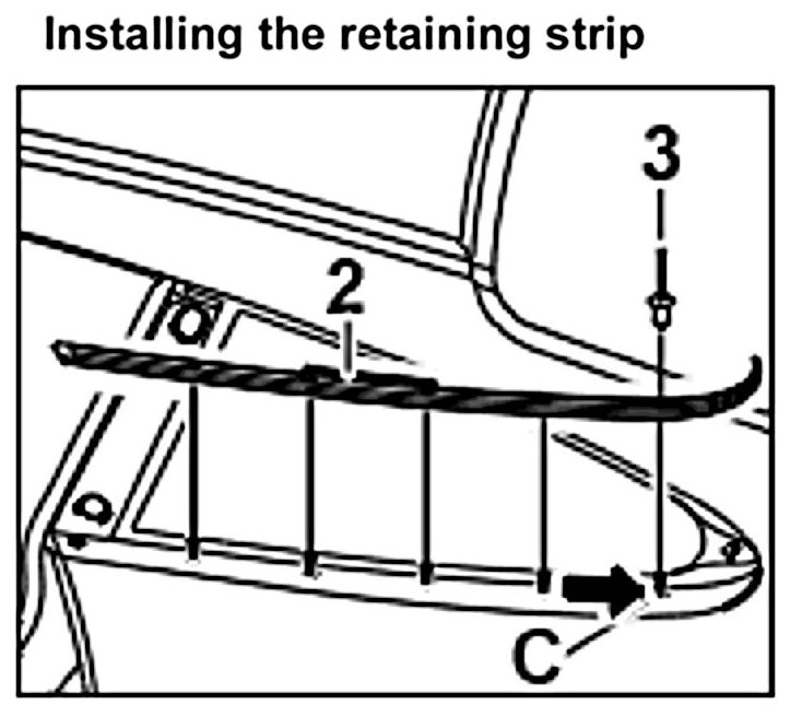Position the retaining strip -2- on the centering hole -C- and rivet the retaining strip down using the pop rivet -3- . When riveting down the retaining strip, press toward the rear in the -direction of arrow- . Then rivet down all pop rivets.