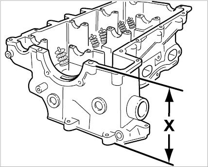 The permissible wear dimension -X- for the height of the cylinder head is: 141.65 mm
