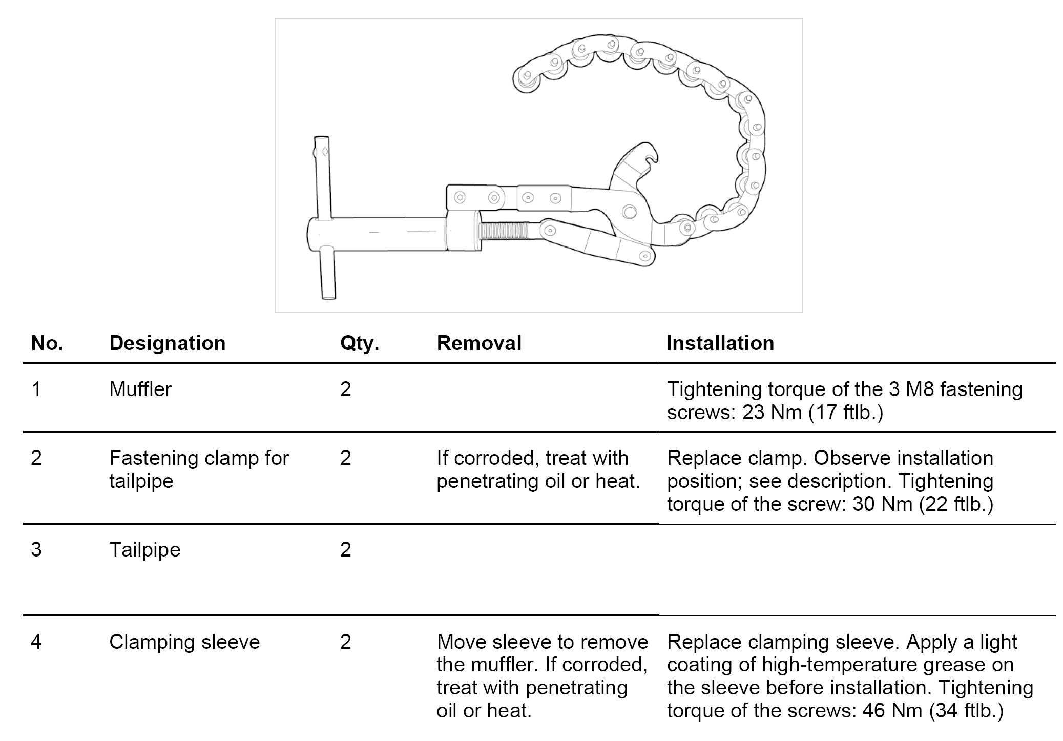 Tightening torque for the M8 hexagon-head bolts on the muffler holder: 23 Nm (17 ftlb.)