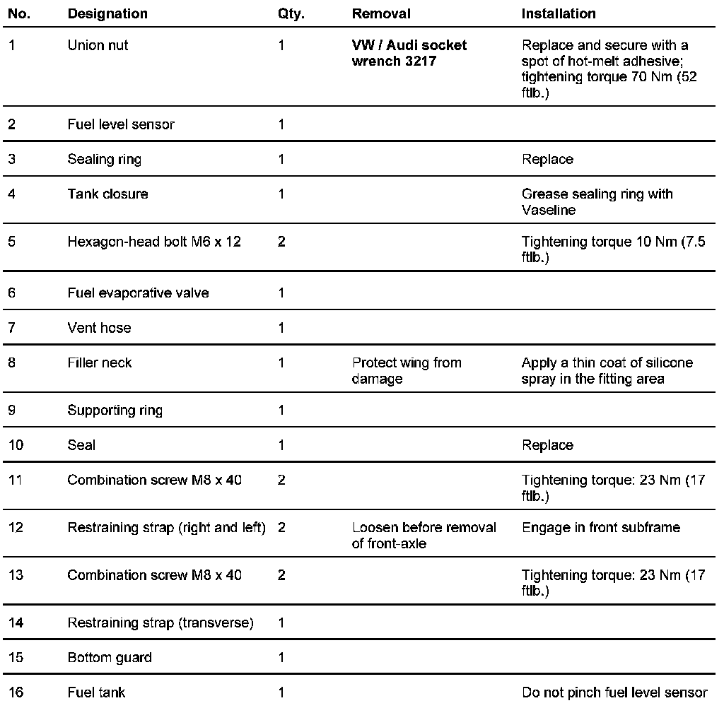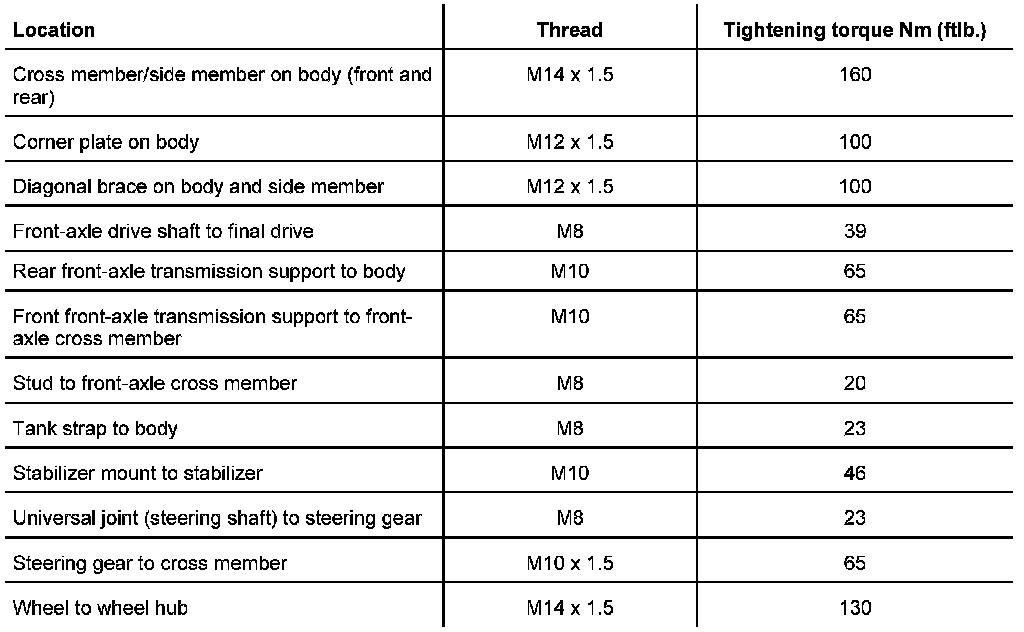 Tightening torques for front axle and fuel tank