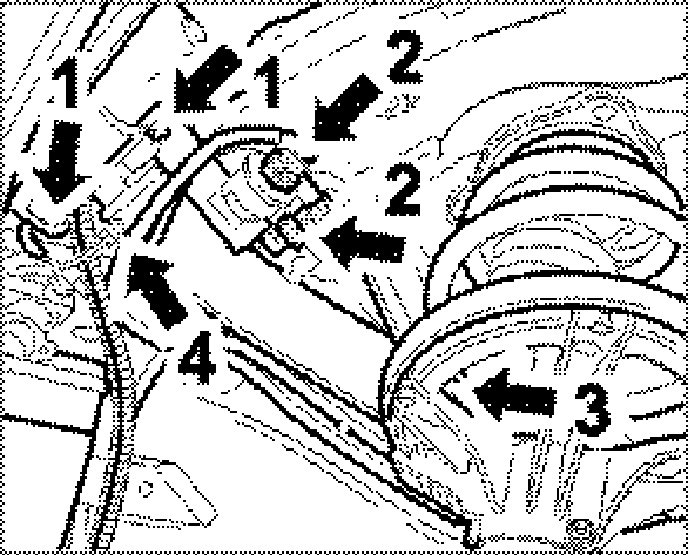 7. Fasten coolant pipes at front. To do this, insert two aluminium pipes and a vent line in the network into the corresponding coolant hoses and fit the five spring-band clamps (1 clamp for vent line on the distributor hose in the left front wheel well -Item 2- and four clamps for coolant pipes -Item 4 in next figure- ).